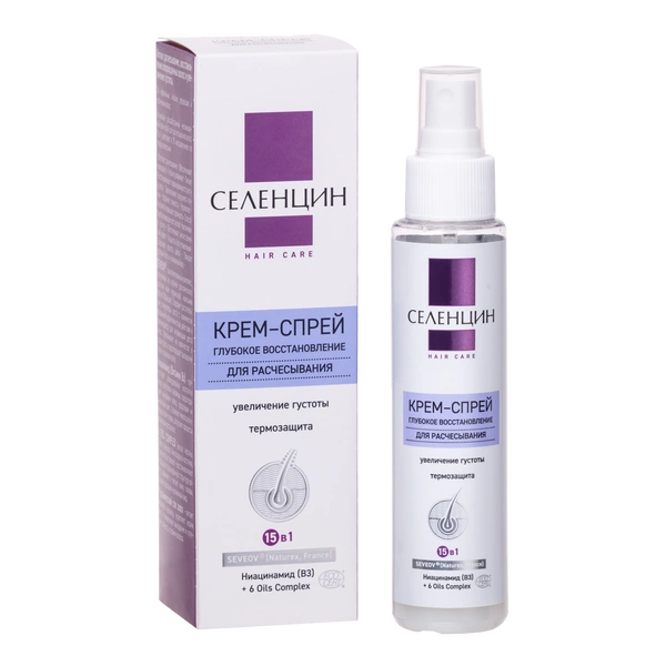 Переходя к продуктам для волос, хотелось бы отметить этот крем-спрей 15в1 от Селенцин с необычным запатентованным французским комплексом, полученным из клубней экзотического растения маки перуанской. Этот растительный стимулятор роста волос имеет клинически доказанную эффективность. Ведь он не просто укрепляет волосы, а еще и целенаправленно активизирует их рост, увеличивая количество волос в активной фазе и переводя тонкие пушковые волосы в стадию здоровых и взрослых. Кроме того, формула нацелена на комплексный уход. Органический сок алоэ питает волосяные луковицы и укрепляет корни, а ниацинамид (витамин B3) — работает на микроуровне: улучшает микроциркуляцию кожи головы и препятствовует затвердеванию коллагена вокруг фолликула, что является одной из причин выпадения. Поэтому, если вы страдаете от потери волос, отечественный хит поможет вам быстро решить эту проблему, а также восстанавит их структуру, увлажнит кожу головы и придаст прядям ухоженный и здоровый вид.