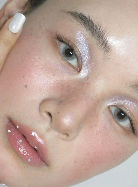 Для начала сделайте идеально ровный тон с легким персиково-розовым румянцем. На веки нанесите светлые розово-бежевые тени без сильного шиммера, а на губы — нежный розовый блеск или матовую помаду цвета увядшей розы. Но главный секрет, который превращает простой нюд в денежный макияж, — это серебристый хайлайтер. Возьмите продукт с холодным, почти белым или нежно-розовым отливом. Нанесите его кончиком пальца или кистью на самые высокие точки: скулы, спинку носа, центр лба, надбровные дуги и внутренние уголки глаз. Такой прием не просто добавляет блеска, а создаст эффект легкого холодного сияния, как от лунного света или утреннего инея на щеках. Он будет контрастировать с теплотой розового нюда и сделет лицо более живым.