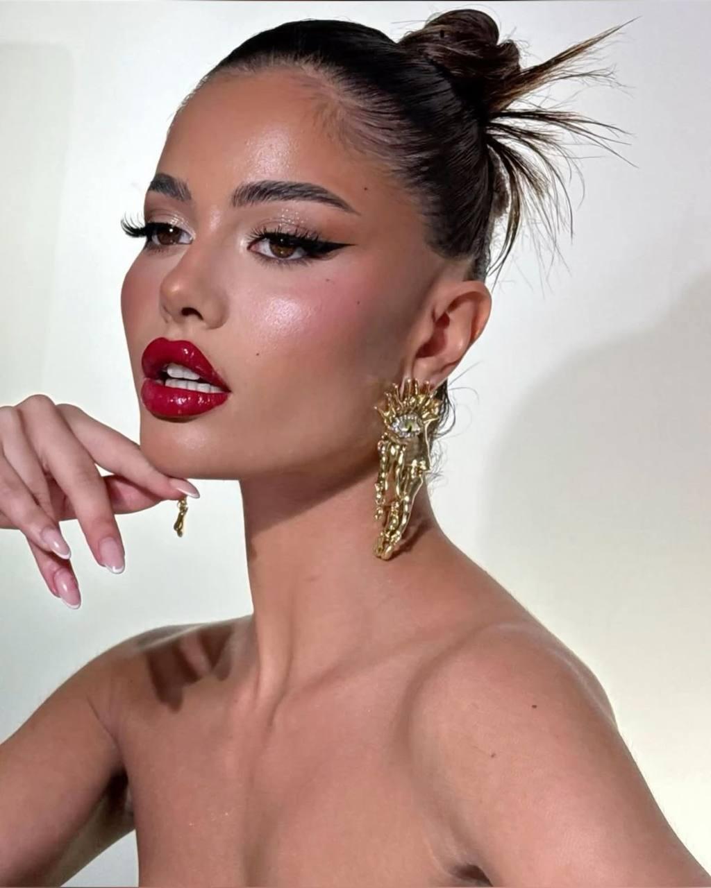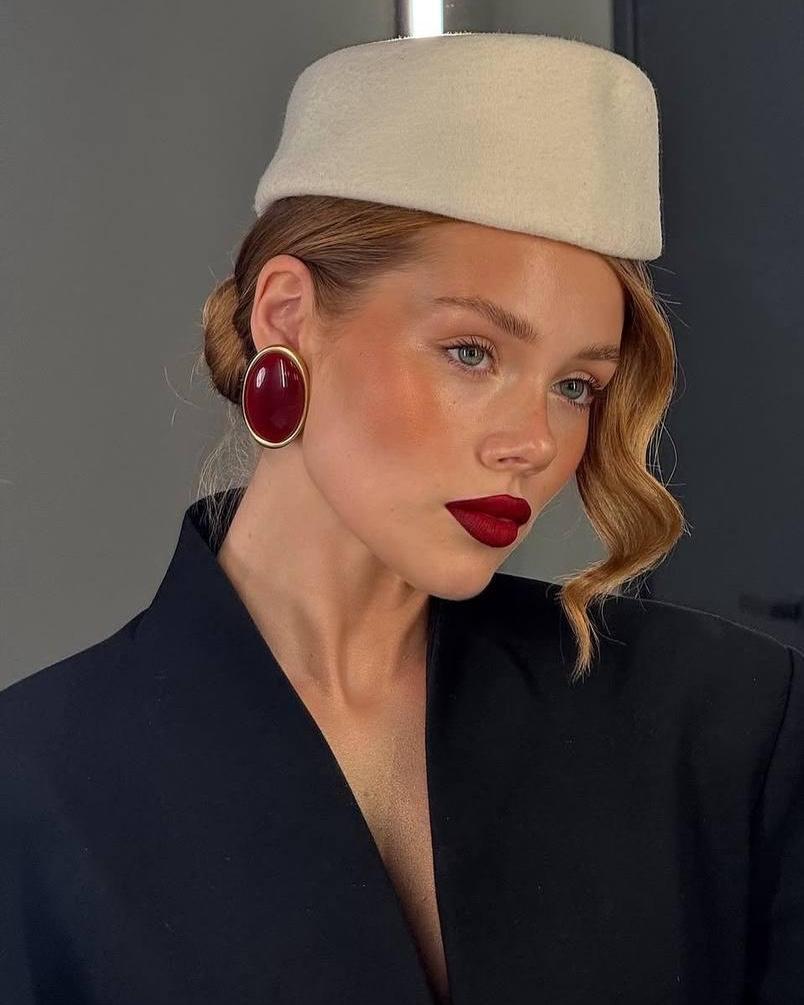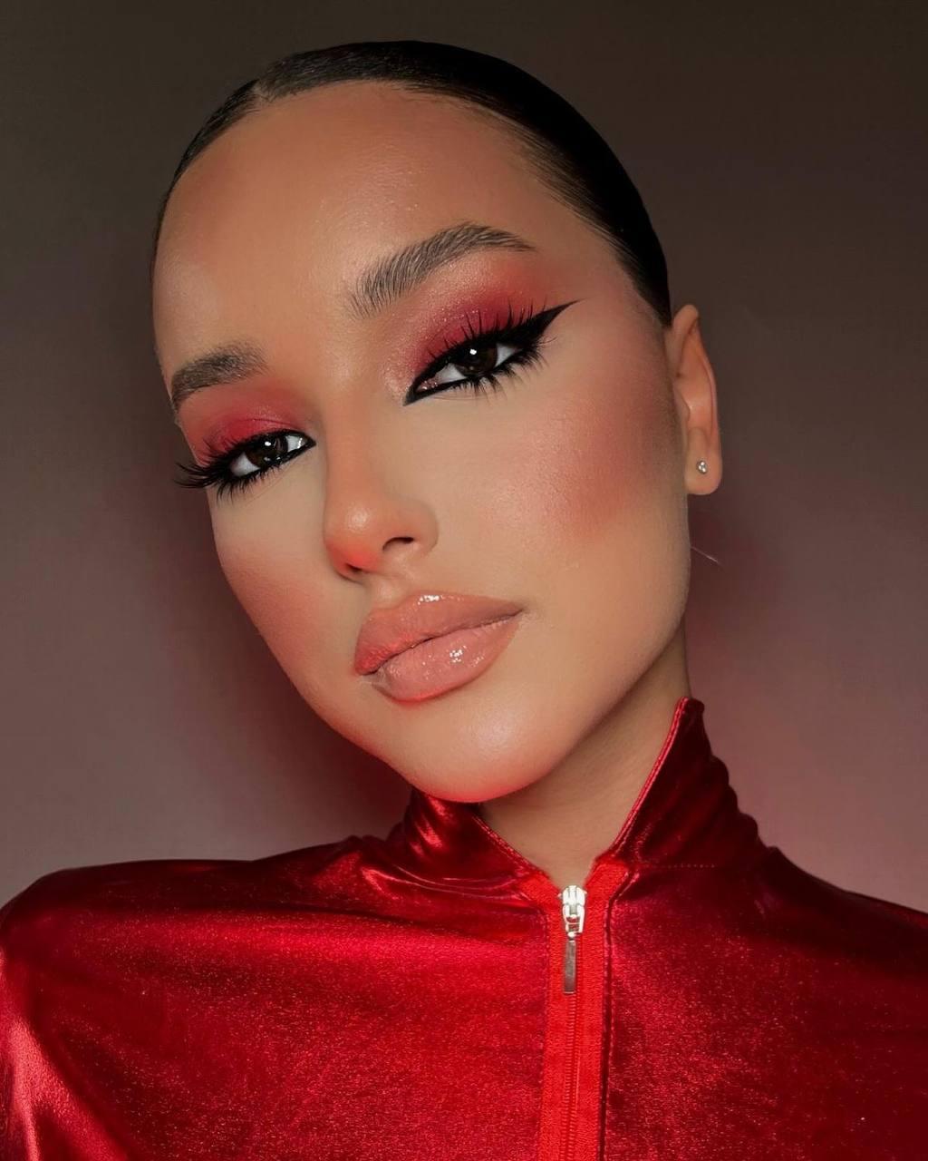 Третий вариант — самый смелый и страстный. Это денежный макияж на Новый год с алым акцентом. Красный — цвет силы, власти, смелых решений и страсти. В Древнем Риме это был цвет императоров, в Китае — цвет удачи и процветания. Поэтому важно использовать его с умом. Пусть ярким будет что-то одно: либо идеальные алые губы, либо дерзкий алый смоки на глазах. Если выбираете губы, то глаза должны быть максимально нейтральными. Если решаетесь на дымчатые красные тени, то губы можно накрасить бежевым или просто прозрачным блеском.