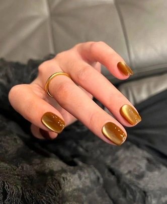 Маникюр с эффектом стекла, который создается с помощью гель-лака «кошачий глаз» сразу добавит вашему образу современного лоска. Полупрозрачные слои с мельчайшими блестками создают ощущение легкости и глубины, будто на ногтях играет свет. И такой дизайн выбирают не только для красоты — его прозрачная, чистая текстура символизирует ясность намерений и открытость новым возможностям. Используя стеклянный шиммер в качестве основы или акцента, можно создать денежный маникюр на январь 2026, который будет притягивать взгляды и одновременно настраивать на волну финансовой удачи. Он выглядит дорого и аккуратно, поэтому вы точно не захотите менять его на что-то другое.