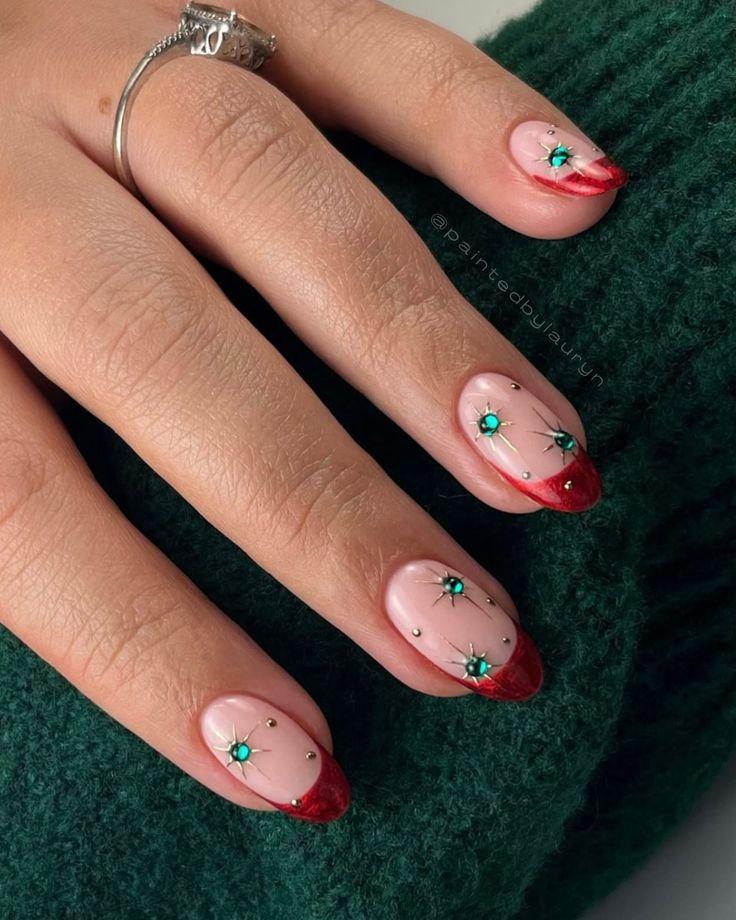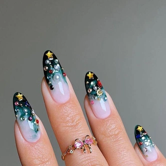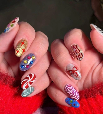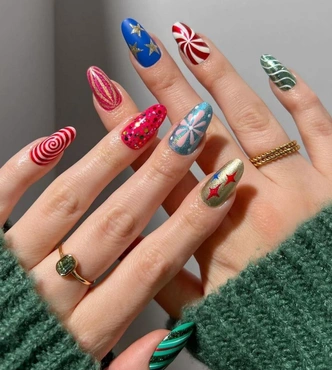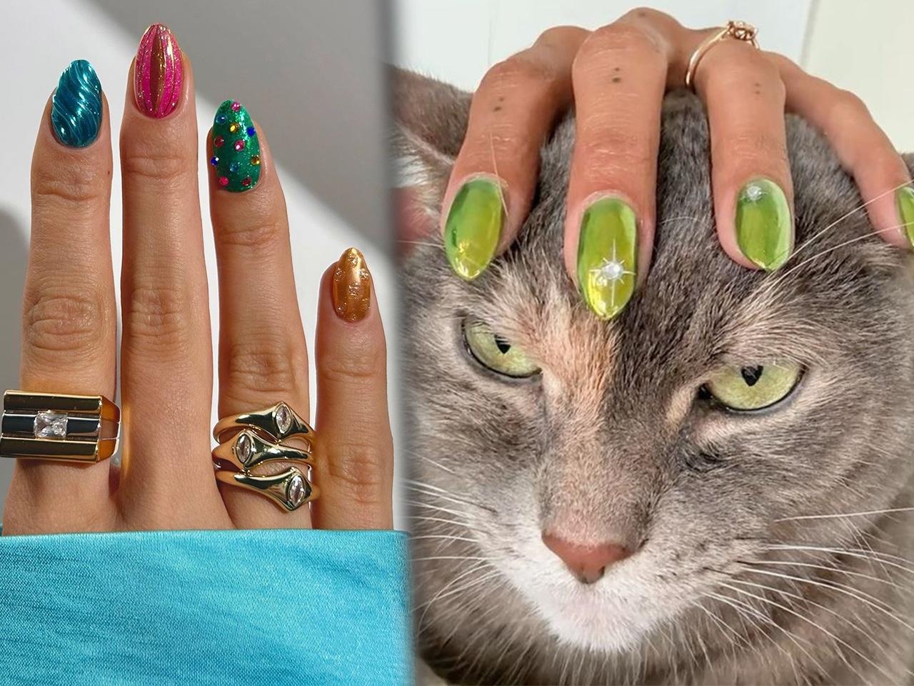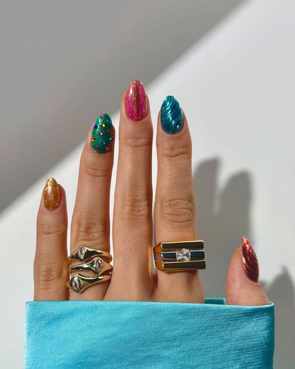 А теперь рассказываем поподробнее, как может выглядеть такой предновогодний дофаминовый маникюр. Это не обязательно должен быть сложный рисунок. Представьте себе простой однотонный лак, но не какой-нибудь, а, например, ярко-зеленый, покрытый сияющей втиркой и усыпанный стразами. Или мерцающий «кошачий глаз» с градиентом, переходящим в россыпь звезд. Можно пойти дальше и смешать на ногтях все краски праздника: полоски, напоминающие рождественские леденцы, яркий разноцветный горошек, зеленый омбре, похожий на пушистую елку, или френч, где каждый ноготь украшен крошечным разноцветным бантом, будто это миниатюрный подарок. Золотые ногти с алыми звездами, разноцветные пальцы с рисунками оленей, снежинок и колокольчиков — вариантов море.