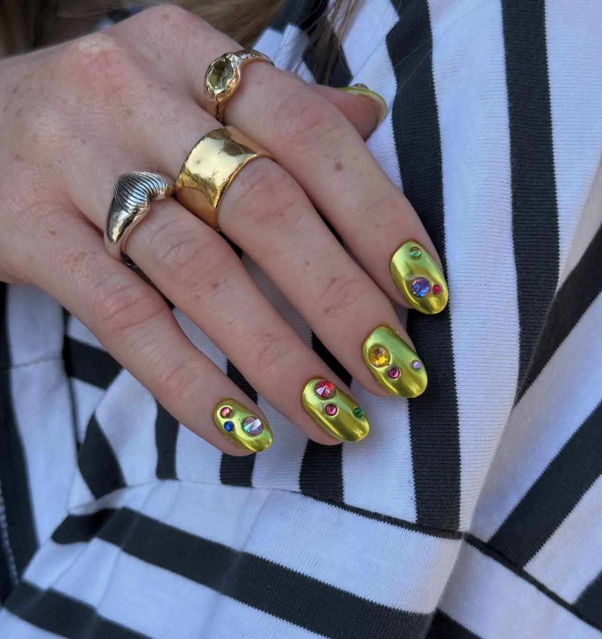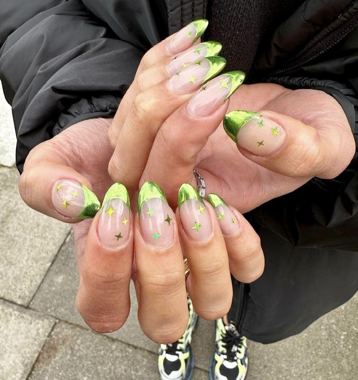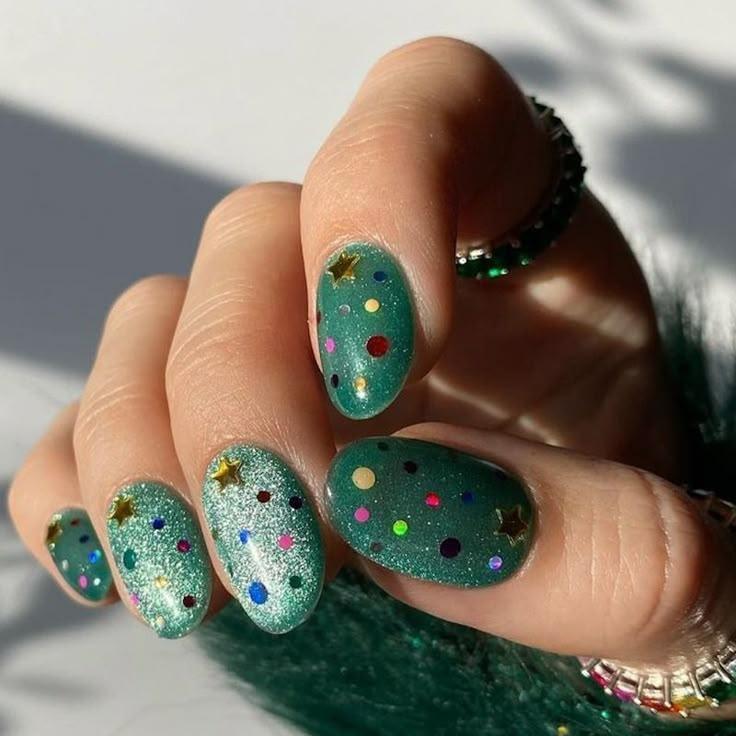 А теперь рассказываем поподробнее, как может выглядеть такой предновогодний дофаминовый маникюр. Это не обязательно должен быть сложный рисунок. Представьте себе простой однотонный лак, но не какой-нибудь, а, например, ярко-зеленый, покрытый сияющей втиркой и усыпанный стразами. Или мерцающий «кошачий глаз» с градиентом, переходящим в россыпь звезд. Можно пойти дальше и смешать на ногтях все краски праздника: полоски, напоминающие рождественские леденцы, яркий разноцветный горошек, зеленый омбре, похожий на пушистую елку, или френч, где каждый ноготь украшен крошечным разноцветным бантом, будто это миниатюрный подарок. Золотые ногти с алыми звездами, разноцветные пальцы с рисунками оленей, снежинок и колокольчиков — вариантов море.