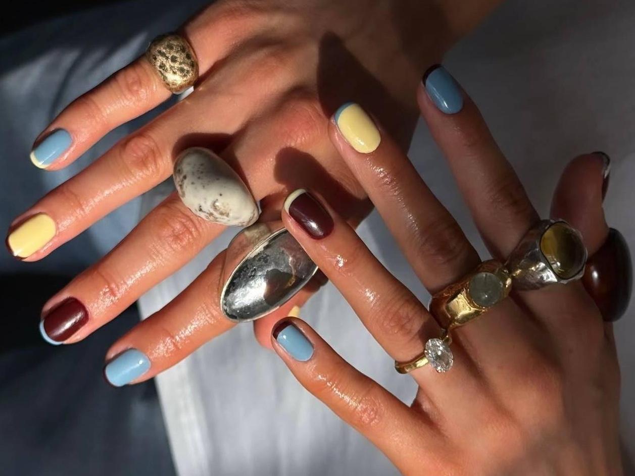Это выбор для тех, кто не может определиться с одним оттенком. Представьте все модные осенние цвета сразу: сливовый, баклажанный, шоколадный, холодный светло-серый, бледно-сиреневый, масляно-желтый, голубой и тыквенный. Каждый ноготь тут выполнен в разном цвете, и «улыбка» при этом контрастная, в другом тоне. Получается настоящий осенний градиент, который сочетается со всем сезонным гардеробом. При этом, несмотря на смелость идеи, маникюр не выглядит вызывающе и действительно универсален.