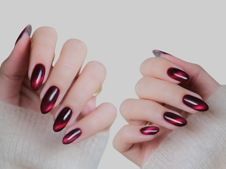 Эффект «кошачьего глаза» давно вышел за рамки модной новинки и стал классическим решением, к которому мы уже привыкли. За счет мягкого мерцания и переливов оттенков ногти походят на драгоценный камень, и выглядит это очень красиво и необычно. Опять же, такой вариант подойдет для любых локаций и ситуаций.
