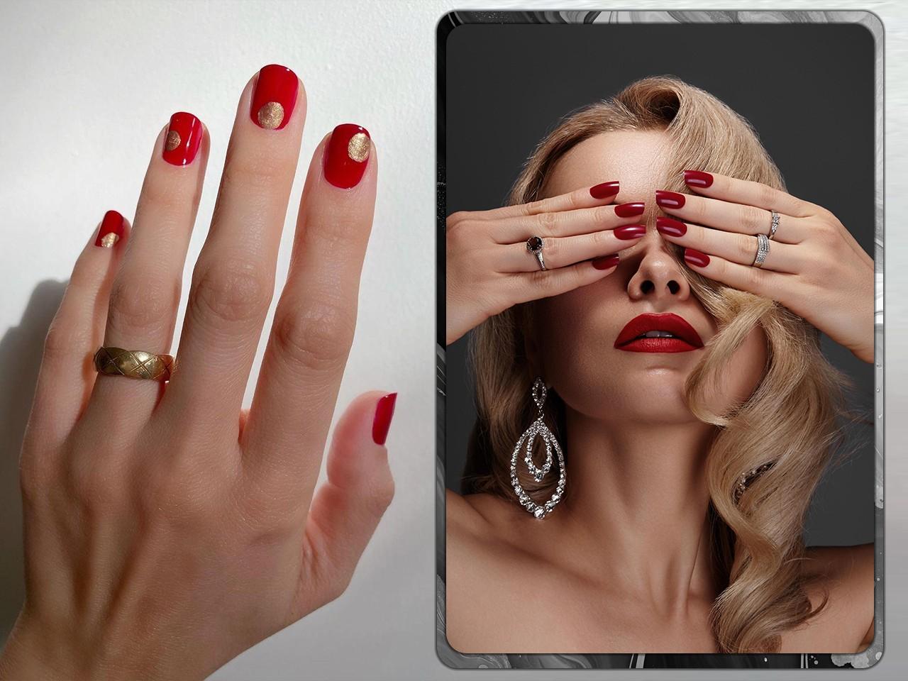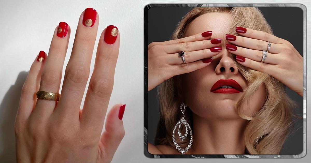 Красный и золото — союз силы и роскоши. Этот интригующий дуэт словно создан для хмурого ноября, когда особенно хочется праздника без повода. Главное в данном случае — не переусердствовать. Пара золотых линий, блестящая лунка или акцентный ноготь вполне справятся с задачей привлечь взгляды.