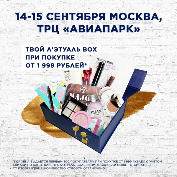 Также первые 300 покупателей каждого из дней, совершившие покупку на 1 999 рублей, получат фирменный Л’Этуаль-box.