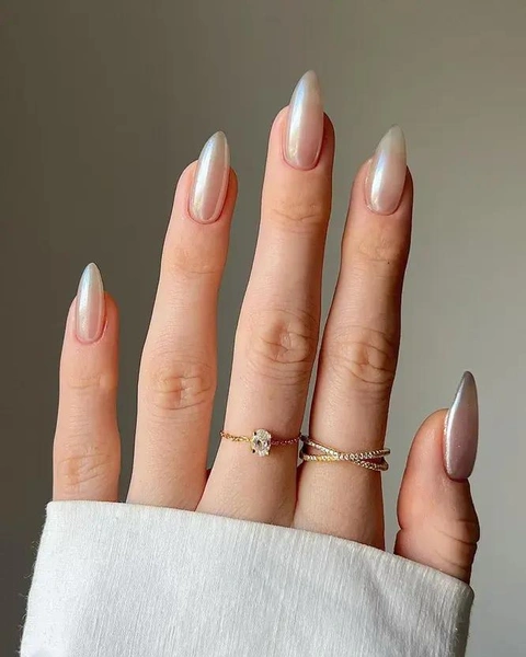 Этот маникюр можно считать логичным продолжением glazed donut nails, только теперь без активного жемчужного перламутра и плотного покрытия. Все максимально актуально и «чисто»: прозрачная база, немного сияния и идеально глянцевый топ. Такой дизайн выглядит еще более универсально и будто подстраивается под настроение образа, не перетягивая на себя внимание.