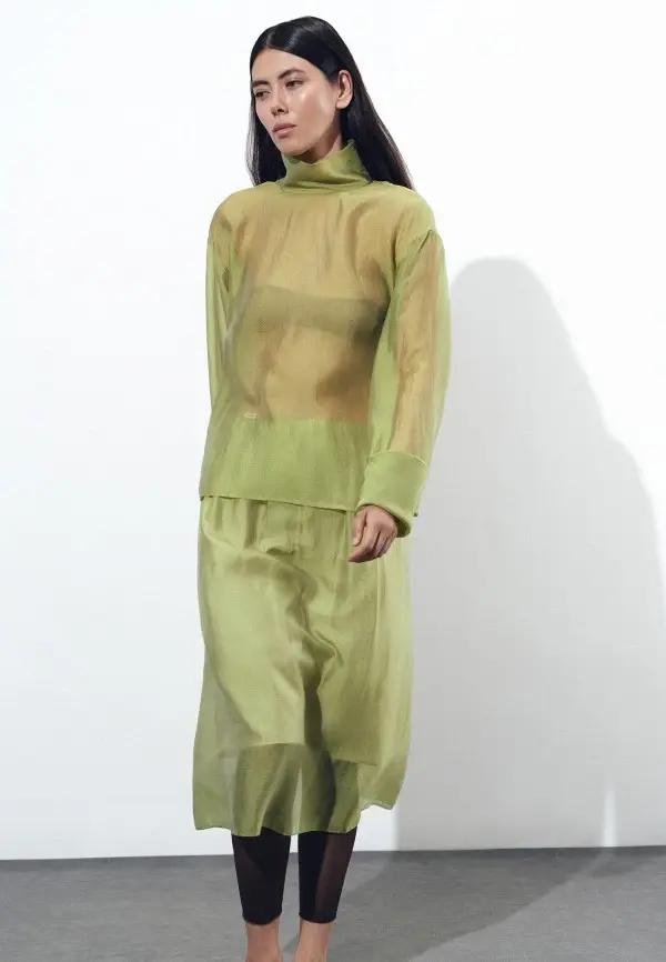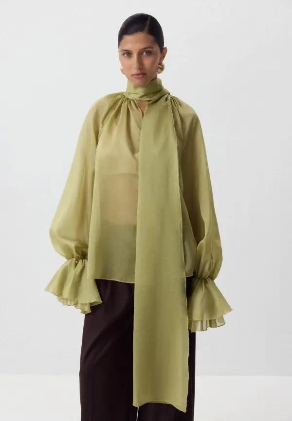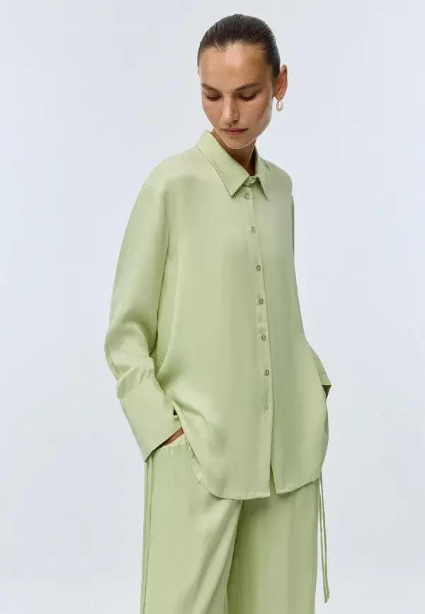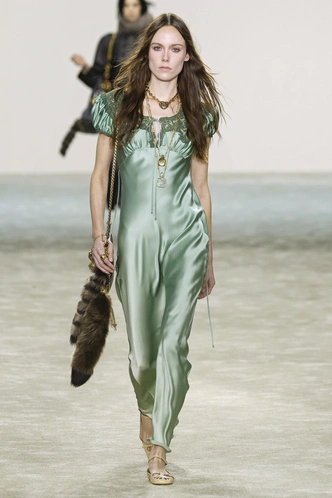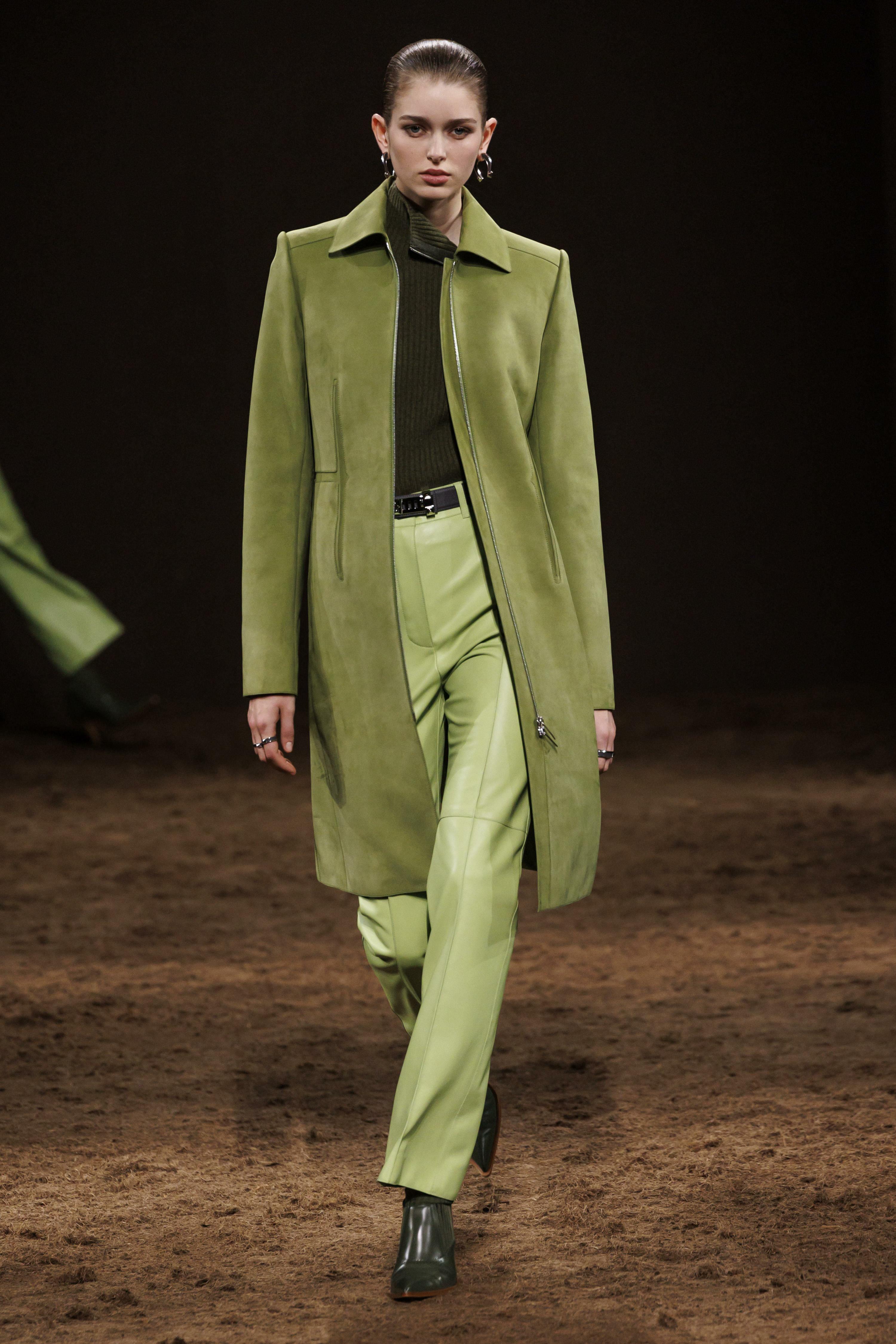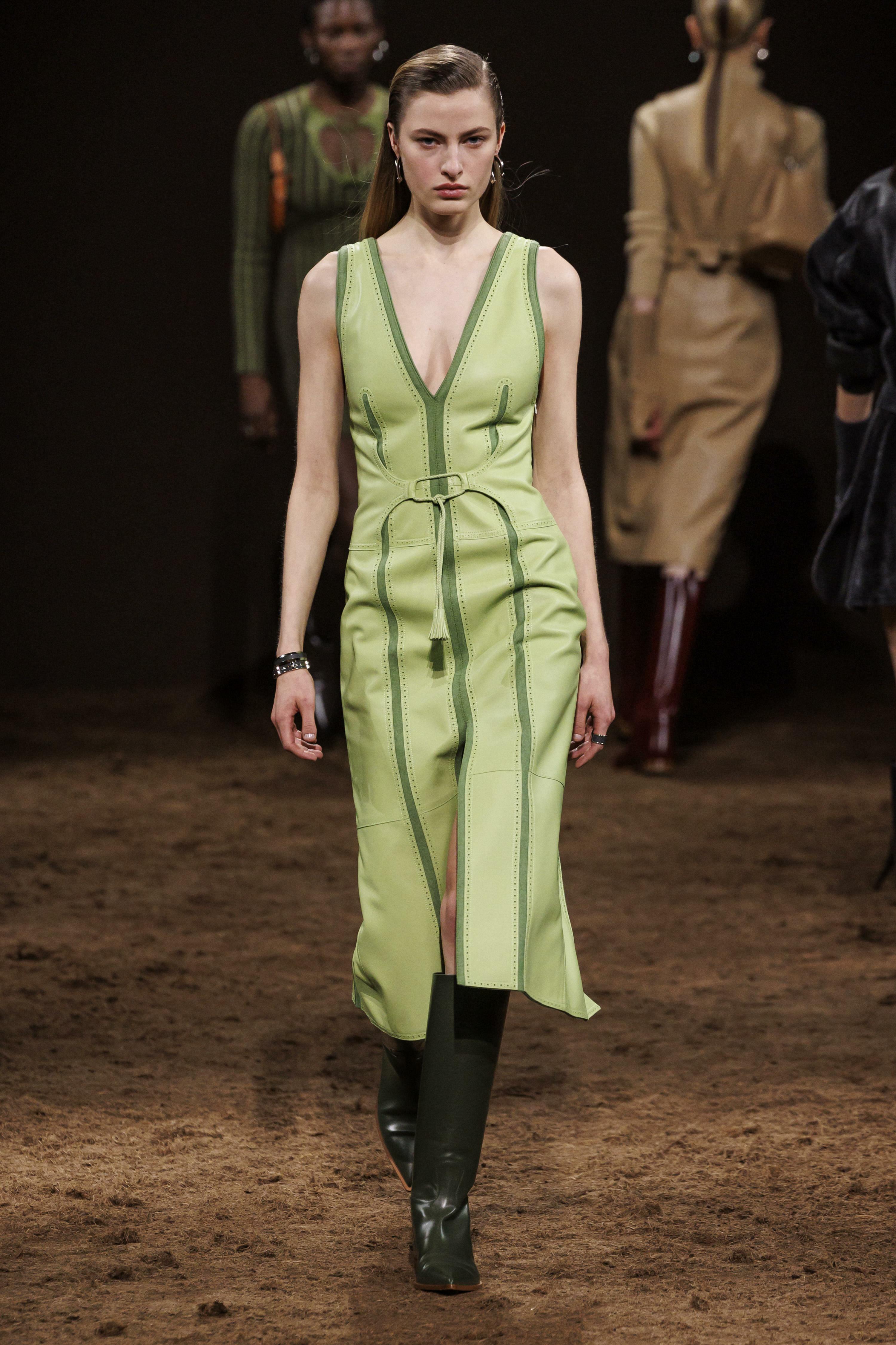 Также фисташковый можно было увидеть в неожиданных решениях, например, в коже, замше и шелке. Так, Hermès создал тотал-лук из кожаной куртки и брюк этого цвета, доказав, что он может выглядеть смело и современно даже в таких дерзких и грубых материалах. А струящееся платье-комбинация Chloé с кружевом и рукавами-фонариками стало отличным примером романтичного и очень женственного вечернего образа.