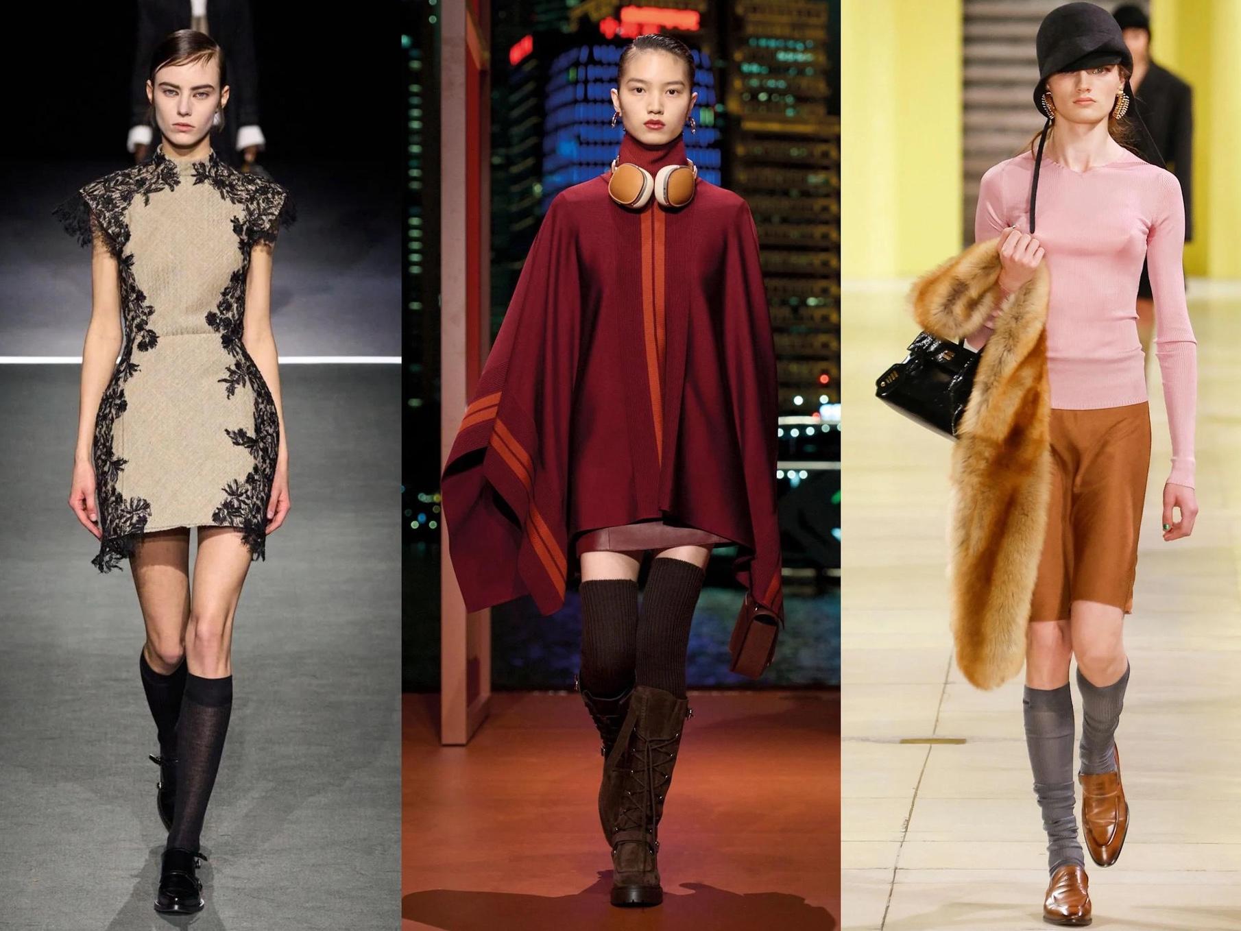 Первые признаки зарождающегося тренда появились еще в 2023 году. Тогда на показе Hermès плотные тканевые модели выглядывали из сапог, создавая эффект многослойности. Однако в сезоне осень-зима 2025/2026 Dior и Florentina Leitner придали им более изящную форму, показав стилизации с капроновыми моделями. За счет этого ноги моделей смотрелись стройнее, а образ в целом выглядел аккуратнее. Сами гольфы начали восприниматься не просто как практичная деталь, а как инструмент для построения силуэта.