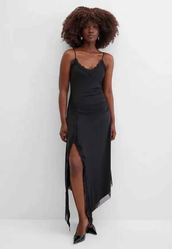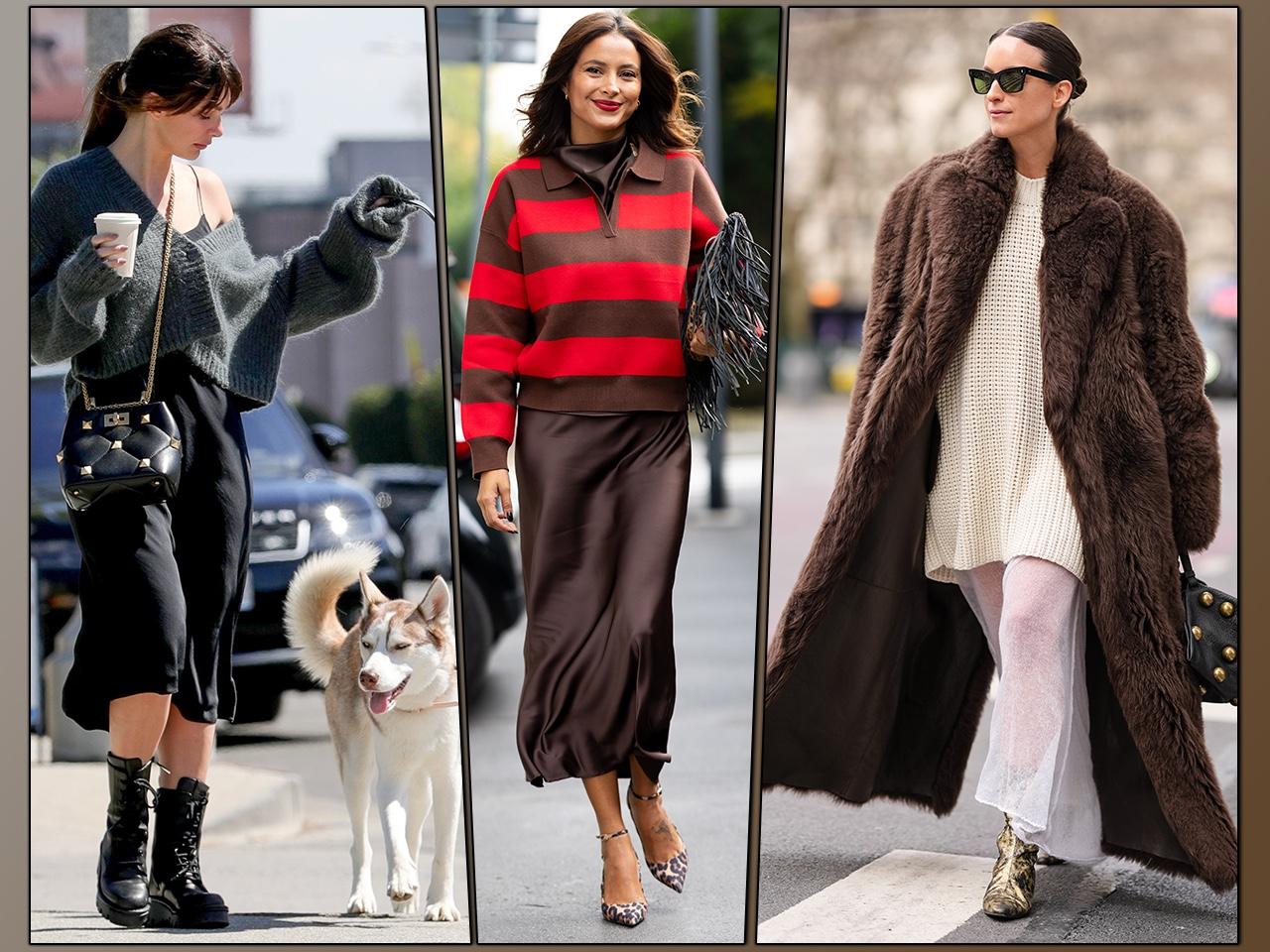 Примеры таких удачных комбинаций можно подсмотреть у звезд стритстайла. Например, больше всего они любят шелковое платье с асимметричным подолом в сочетании с объемным свитером из мягкой шерсти. Также встречаются вариации комбо с более плотным «низом», удлиненными джемперами-оверсайз и акцентными кожаными сапогами. Даже простое полупрозрачное платье в пол может заиграть по-новому, если надеть поверх него свитер с высоким воротом и дополнить образ грубыми лоферами и носками.