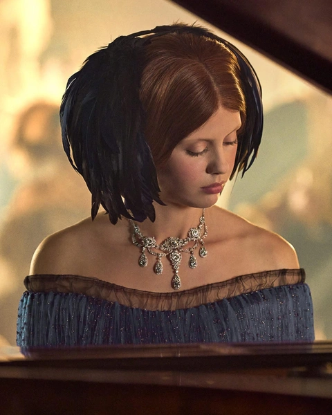 Украшения героини Мии Гот тоже были не просто красивым дополнением. Они создавались в сотрудничестве с Tiffany & Co и имели глубокую символическую связь с персонажем. Художница хотела отразить увлечение Элизабет энтомологией, и в архивах ювелирного Дома нашлись подходящие под этот запрос уникальные варианты. Например, ожерелье с синим жуком, оригинал которого был создан Луисом Тиффани еще в начале 1900-х годов.