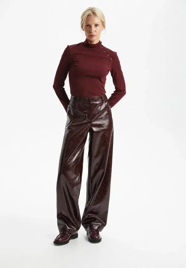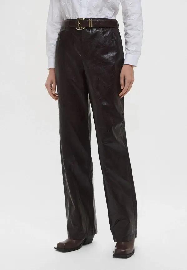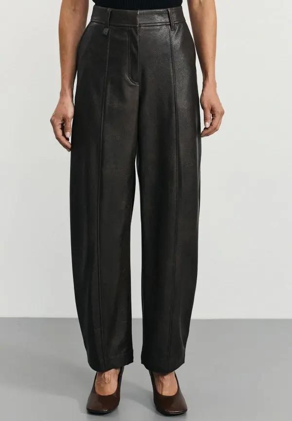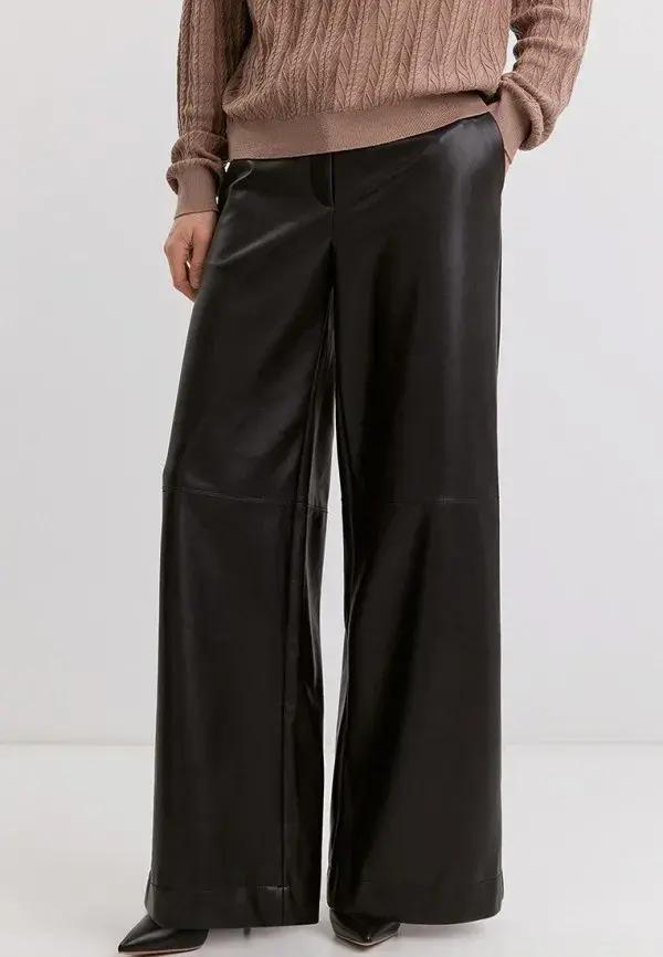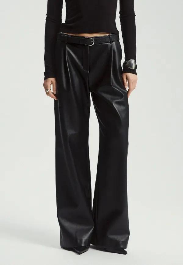 Именно эта уникальная способность обогащать любой лук и сделала кожаные брюки таким хитом. Ведь их фактура сама по себе является украшением. В сочетании с другими материалами они создают интересную игру поверхностей. Представьте их с объемным свитером из грубой шерсти, с мягкой замшевой рубашкой, атласным топом с кружевом или даже с простой хлопковой футболкой. Такой микс рождает сложный и многогранный образ. Добавьте сюда классическое пальто или уютный шерстяной блейзер, и вы получите идеальный аутфит.