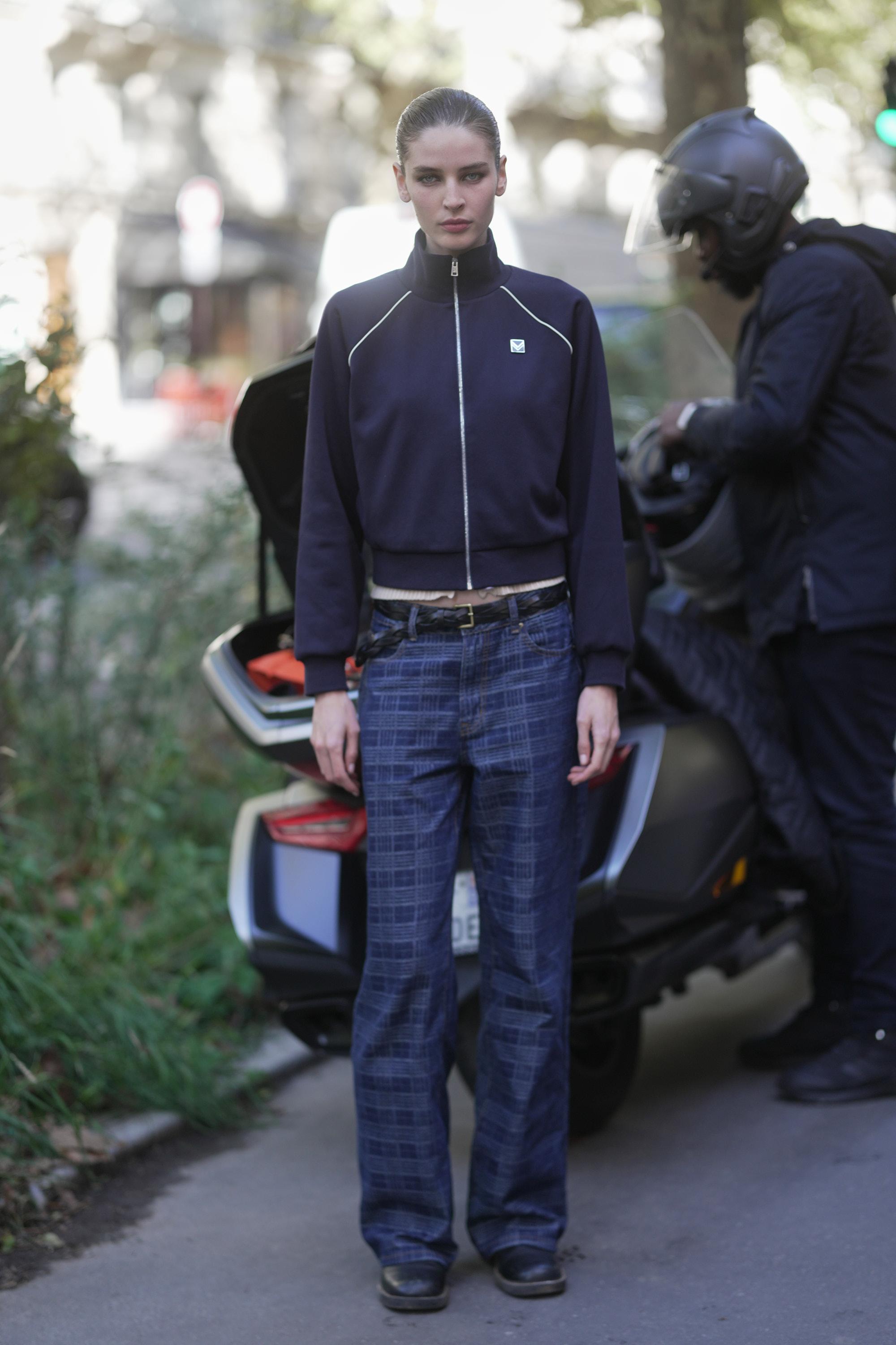 Впрочем, шотландская клетка в сдержанном королевском синем может появиться и в модели, напоминающей джинсы прямого кроя. Элегантные и непринужденные брюки будут идеально сочетаться с укороченной спортивной курткой на молнии.