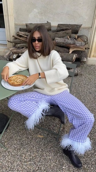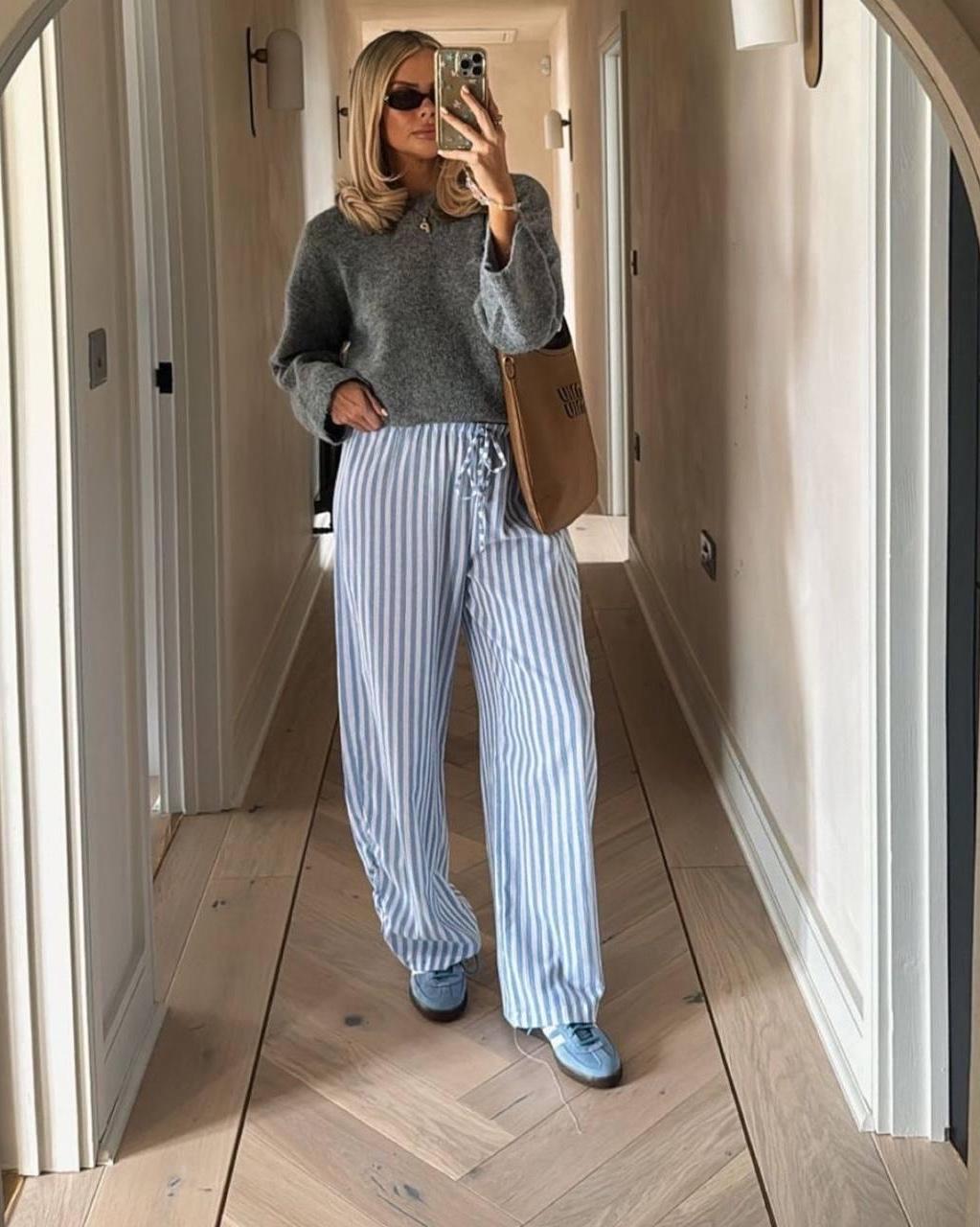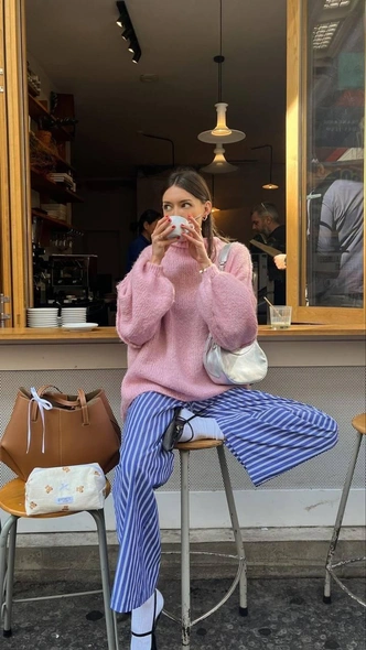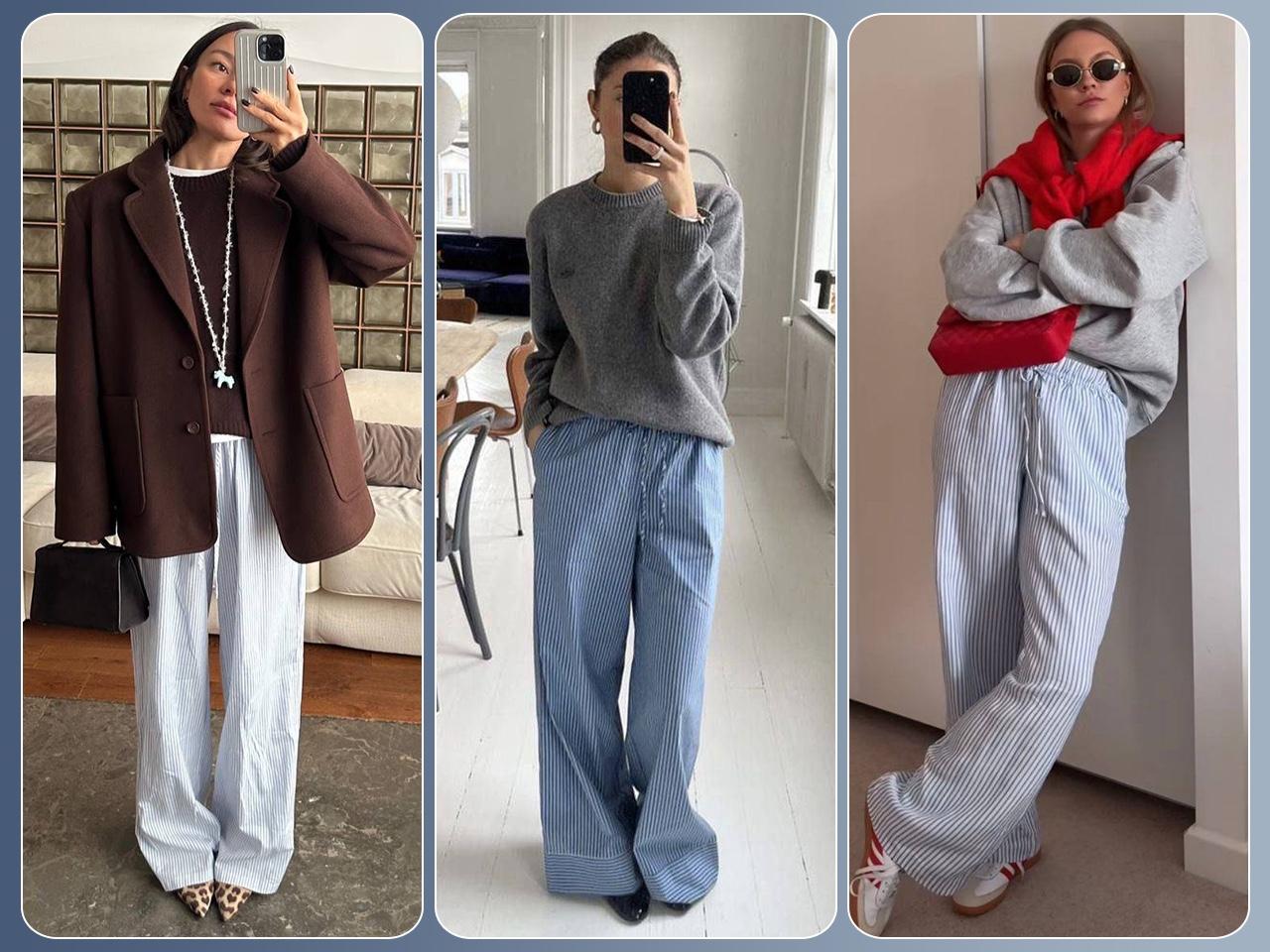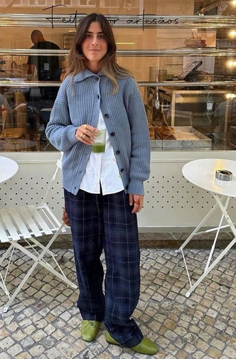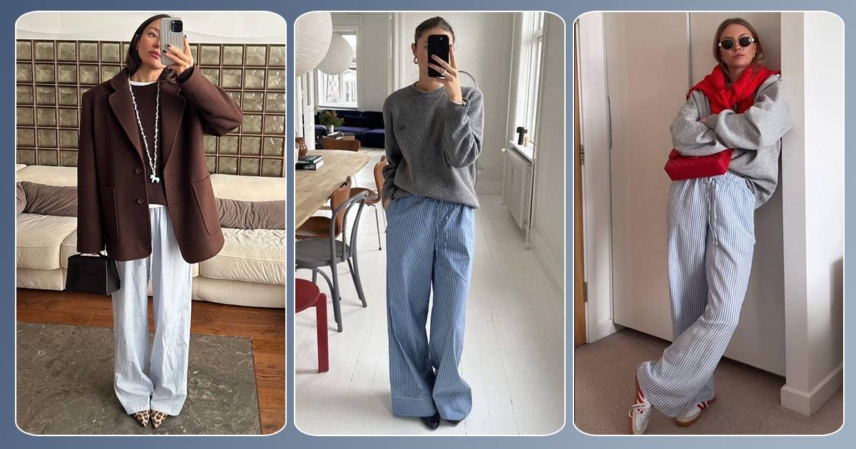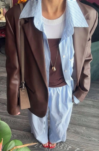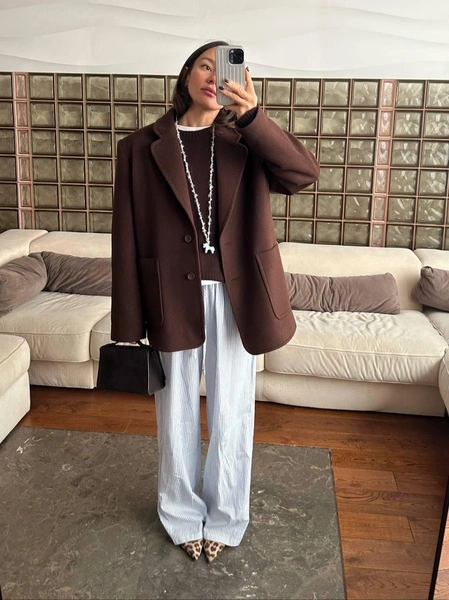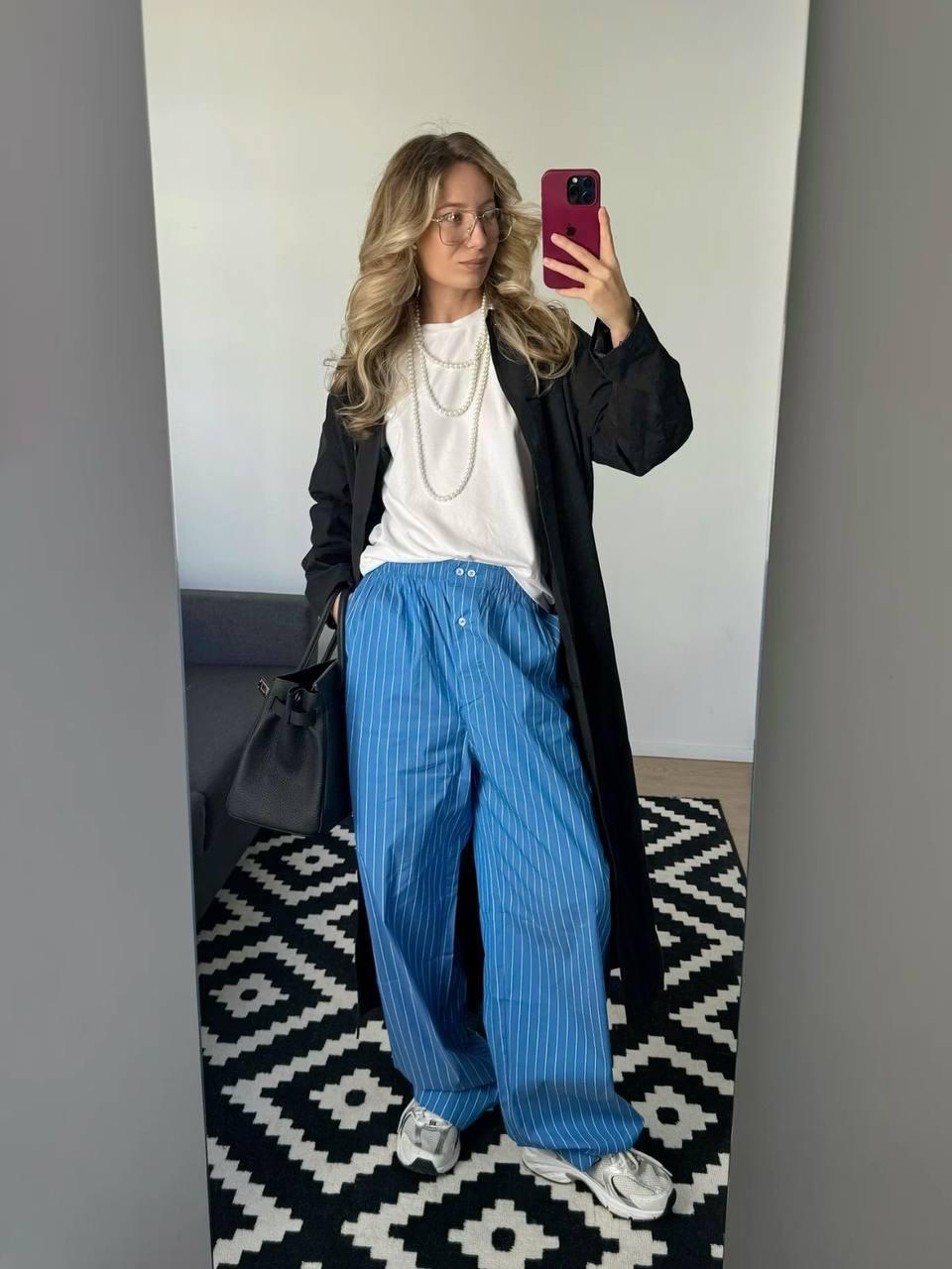 Еще один беспроигрышный вариант — многослойность. Наденьте с пижамными брюками простую футболку или лонгслив, а сверху — джемпер, кардиган, расстегнутую рубашку или жакет. А можно даже несколько вещей сразу. Такой прием не только согреет вас в холодную погоду, но и добавит образу текстуры и глубины.