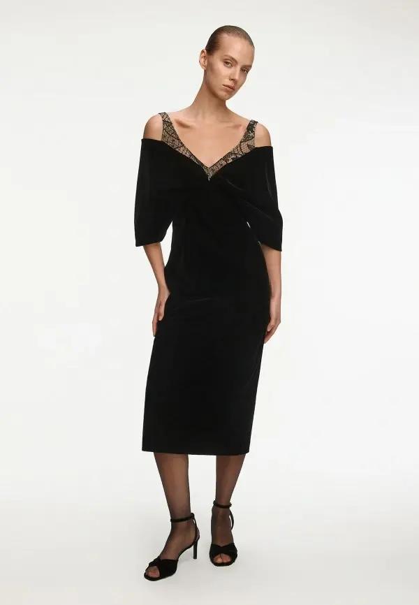 Тяжелые, рельефные кружева, особенно в виде гипюра, тоже утратили свою актуальность. Они могут выглядеть слишком громоздко и «перегружать» образ. Более современный вариант — платья из тканей с легким благородным блеском и летящей текстурой: шелка, атласа или сатина. Такие материалы красиво струятся, мягко переливаются при свете и подчеркивают фигуру, не утяжеляя ее. А если все же хотите добавить в образ кружево, то выбирайте вещи с отделкой на манжетах, вырезе или подоле — это смотрится модно и лаконично.