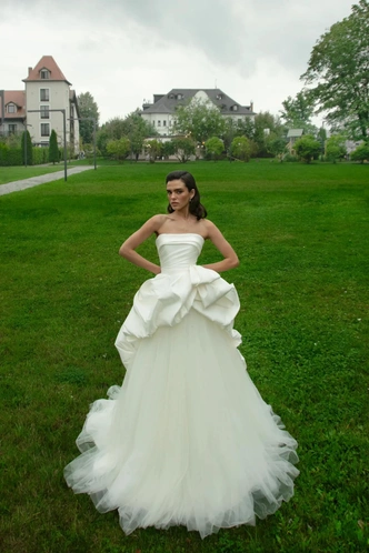 Коллекция «Ле жардин» от Натальи Романовой хоть и визуализирует нам прогулку в летнем саду, но отлично подходит для сказочного зимнего торжества. Объемные детали, 3D-цветы, море кружева и соблазнительных силуэтов.