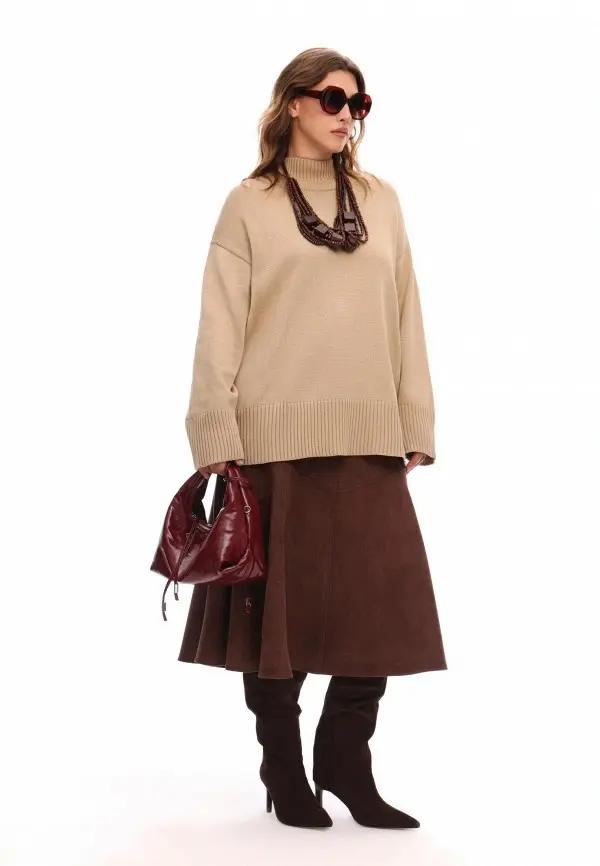 Самая частая ошибка — брать слишком тонкий или слишком пушистый свитер, который добавляет объема в верхней части и делает образ рыхлым. Универсальнее смотрится средняя плотность и аккуратная горловина: круглая или мягкая стойка, которая не режет шею. Если любите оверсайз, пусть он будет контролируемым: плечо на месте, длина закрывает верх бедра, а низ не собирается пузырем.