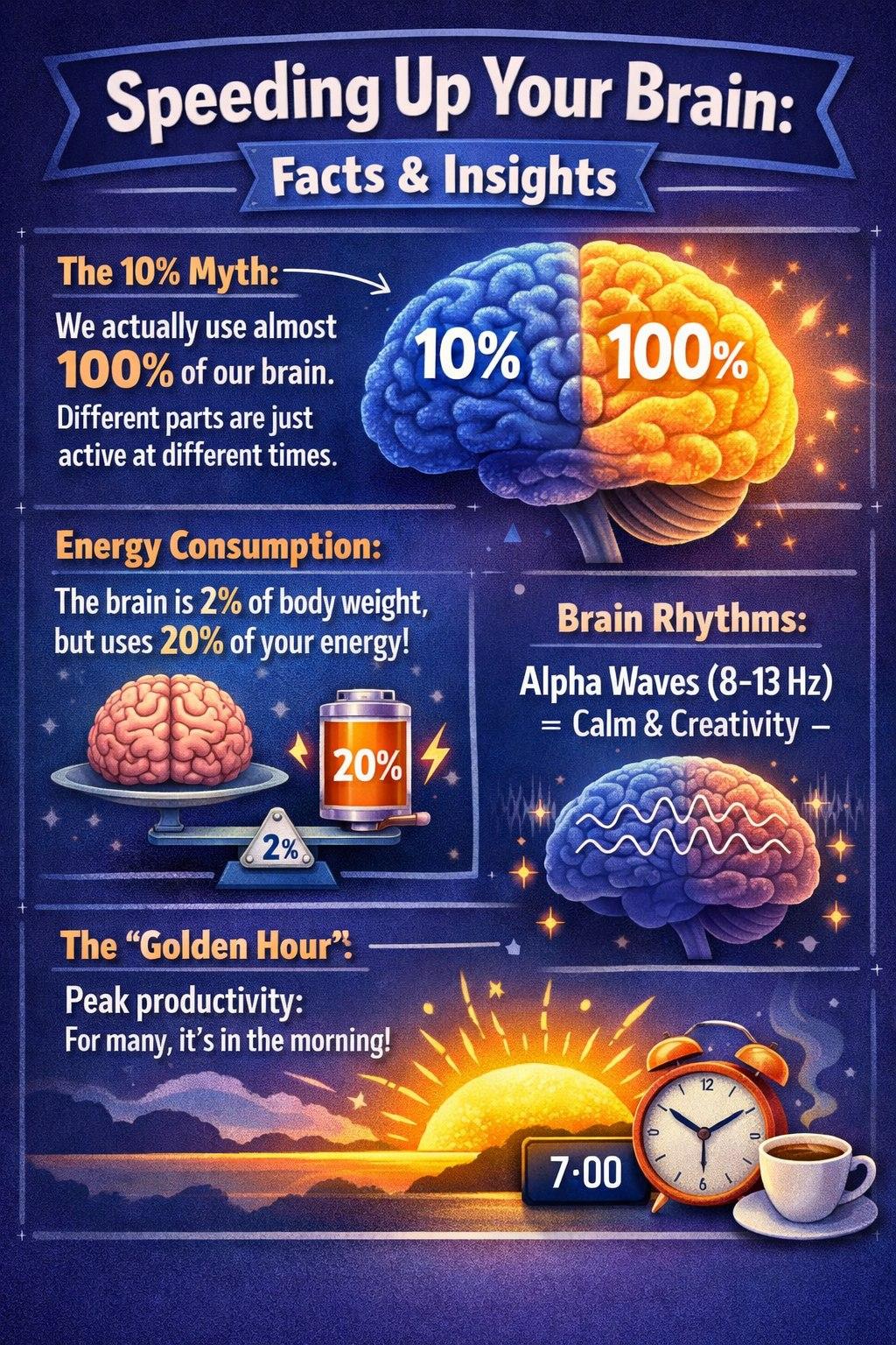 Вот несколько любопытных фактов о том, как «разогнать» мозг или почему он иногда «подтормаживает»: • Миф о 10%: На самом деле мы используем почти 100% своего мозга, просто разные его части активны в разное время для выполнения разных задач. • Энергозатраты: Мозг составляет всего около 2% веса тела, но потребляет около 20% всей энергии. Если бы он работал на «максимальных оборотах» (100% активация всех нейронов одновременно) постоянно, это привело бы к перегреву и истощению организма. • Ритмы работы: Для высокой продуктивности мозгу нужны правильные волны. Например, альфа-ритмы (8–13 Гц) связаны с состоянием спокойного бодрствования и творческим вдохновением. • «Золотой час»: У каждого человека есть периоды пиковой активности, когда мозг работает эффективнее всего — для многих это утренние часы.