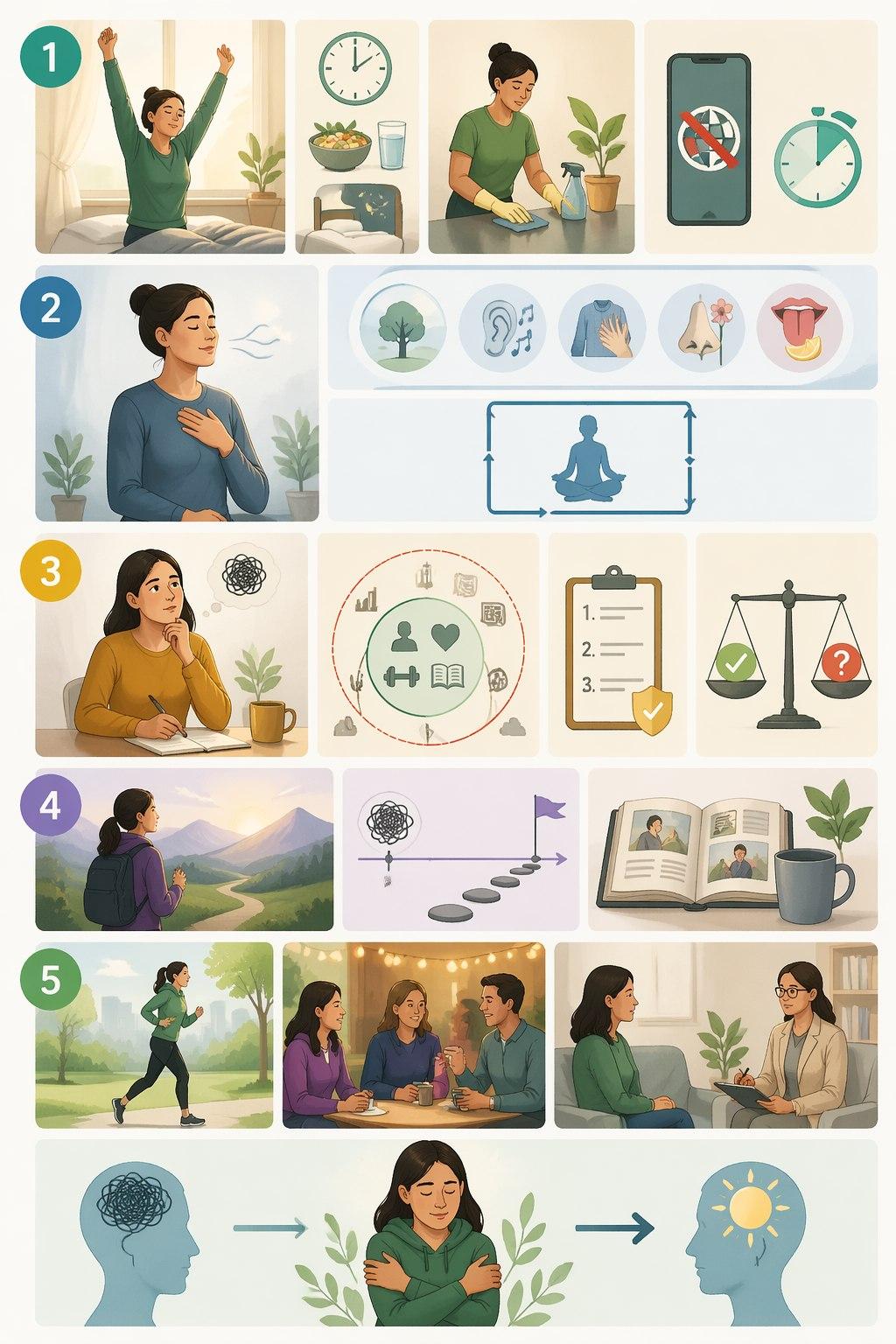 • Метод «5-4-3-2-1»: Назовите 5 предметов, которые видите; 4 звука, которые слышите; 3 ощущения (ткань одежды, тепло); 2 запаха; 1 вкус.