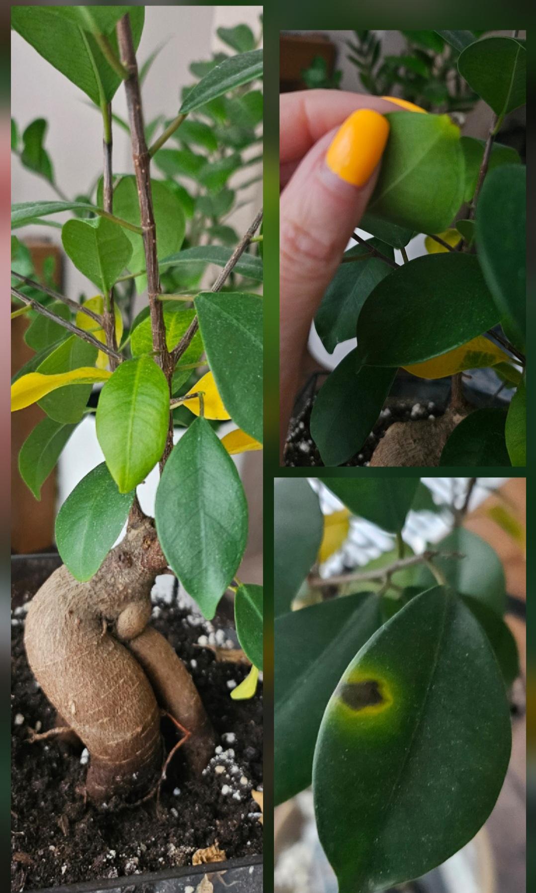 Нехватка азота, магния, железа или других микроэлементов может проявляться в виде жёлтых пятен или прожилок. Дефицит железа вызывает хлороз: межжилковое пространство равномерно бледнеет, потом желтеет, перед опадением может полностью побелеть. Обильный полив или недостаток воды также могут влиять на состоянии фикуса. Температура воздуха неподходящая, сквозняки, нехватка дневного света - причин множество для болезни растения. Надо искать причину.