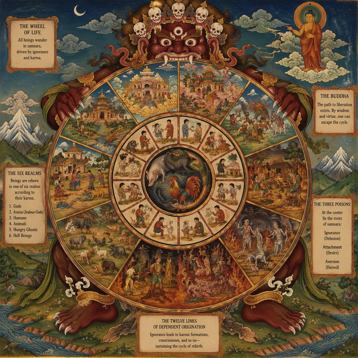Колесо творения Дадзу: Великое колесо возрождения обобщает буддийскую доктрину кармы: бесконечный цикл перевоплощений в высшие или низшие формы жизни в соответствии с прошлыми поступками.