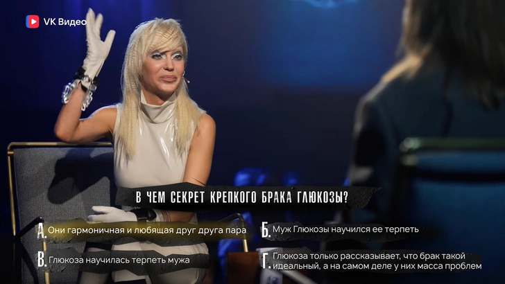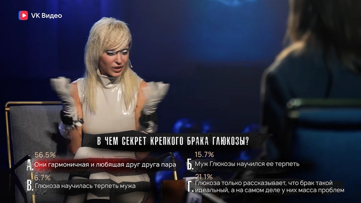 О том, что происходит в их семье сейчас, Глюкоза откровенно в шоу Ксении Собчак «Что о тебе думают?». Один из самых обсуждаемых вопросов касался секрета их прочного союза и реакции мужа на ее внешний эпатаж. Суть проекта состоит в том, что приглашенная звезда должна угадать, какой из вариантов предложенных ответов на вопрос об их жизни больше всего наберет голосов среди зрителей. И вот прозвучал один из самых интригующих вопросов: в чем секрет крепкого брака Глюкозы? Среди вариантов ответов были представлены следующие: «Они гармоничные и любящие друг друга пара», «Муж Глюкозы научился терпеть ее», «Глюкоза научилась терпеть мужа», «Глюкоза только рассказывает, что брак такой идеальный, а на самом деле у них масса проблем».