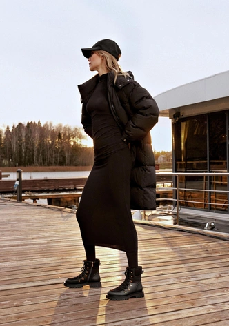 С чем сочетать такую обувь? Попробуйте в этом сезоне повторить самые трендовые образы: наденьте плотные леггинсы, а поверх них — высокие носки в рубчик или объемные гетры. Поэкспериментировать можно и с джинсами: примерьте широкие бэгги и заправьте брючины внутрь ботинка — небрежный, но «комфортный» лук готов.