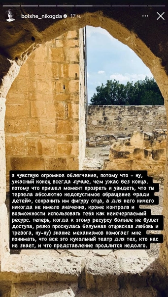 «Я чувствую огромное облегчение, потому что ужасный конец всегда лучше, чем ужас без конца. Потому что пришел момент прозреть и увидеть, что ты терпела абсолютно недопустимое обращение „ради детей“, сохранить им фигуру отца, а для него никогда ничего не имело значения, кроме контроля и возможности использовать тебя как неисчерпаемый ресурс», — рассуждает Полозкова* в соцсетях.