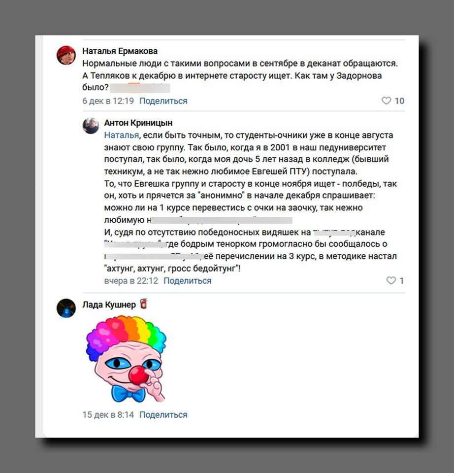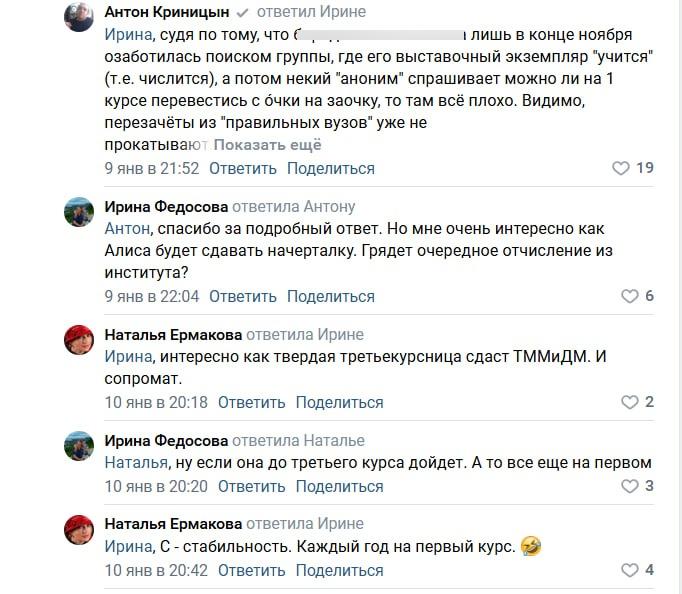 «Судя по тому, что лишь в конце ноября озаботились поиском группы, а потом некий аноним спрашивает, можно ли на 1 курсе перевестись с очки на заочку, то там все плохо. Видимо, перезачеты из ''правильных вузов'' уже не прокатывают», — продолжает Антон Криницын.