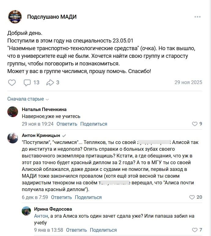 «Поступили», «числимся». Тепляков, ты со своей Алисой так до института и не дополз? Опять справки о больных зубах притащишь? Кстати, а где обещание, что в этот раз точно будет красный диплом за 2 года?», — пишет в комментариях пользователь по имени Антон Криницын.