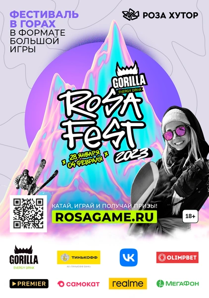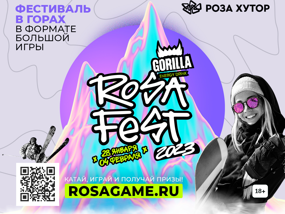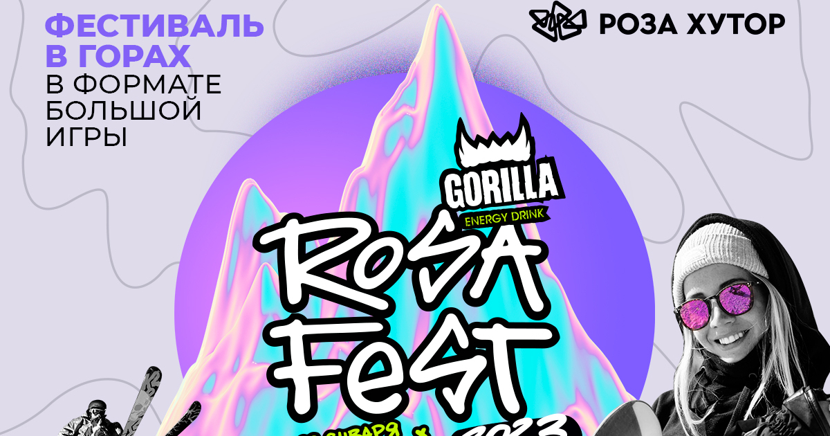 Мероприятие заслуженно получило статус «лучший фестиваль по версии BEMA» и международную премию за лучшее молодежное событие. Сюда едут за комфортом, уютом, понятным окружением. Больше не придется скучать за барной стойкой или разучивать повороты на склоне одному. Вас ждет захватывающий мир новых знакомств на 8-м ежегодном Rosafest x Gorilla Energy 2023!