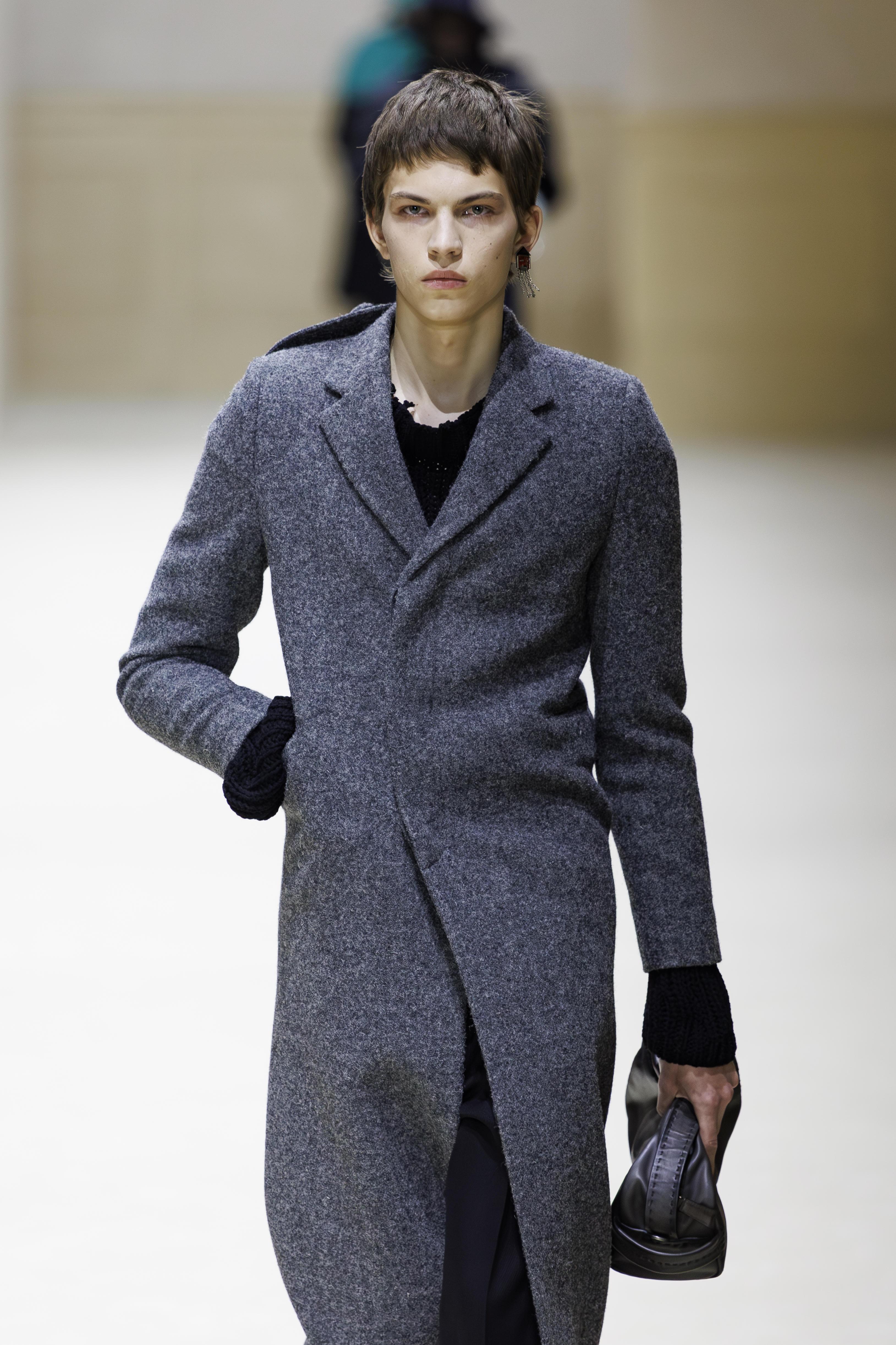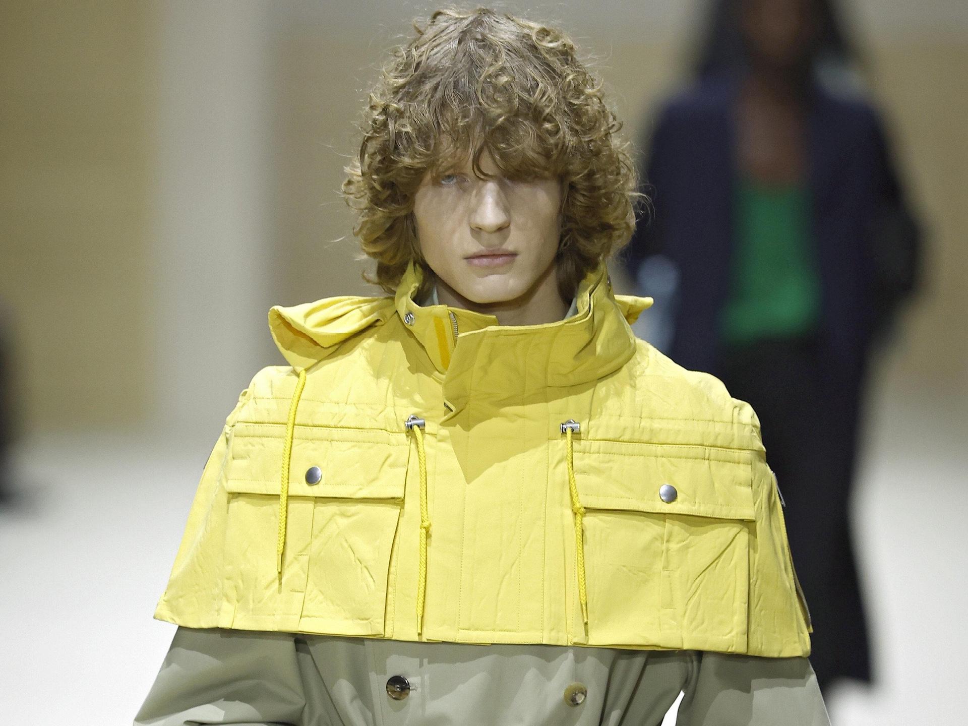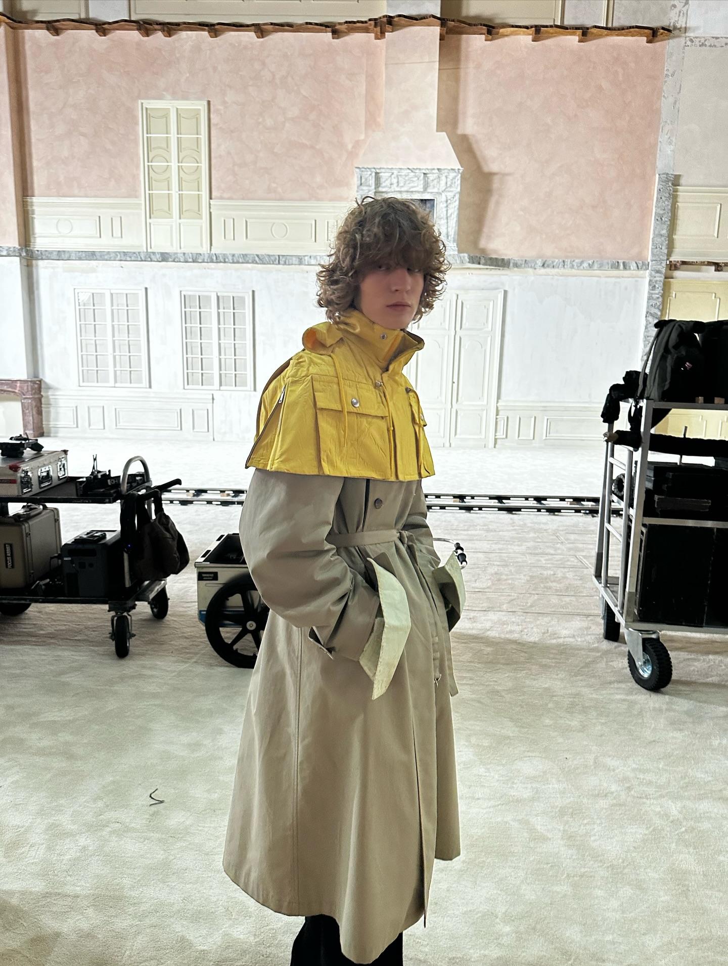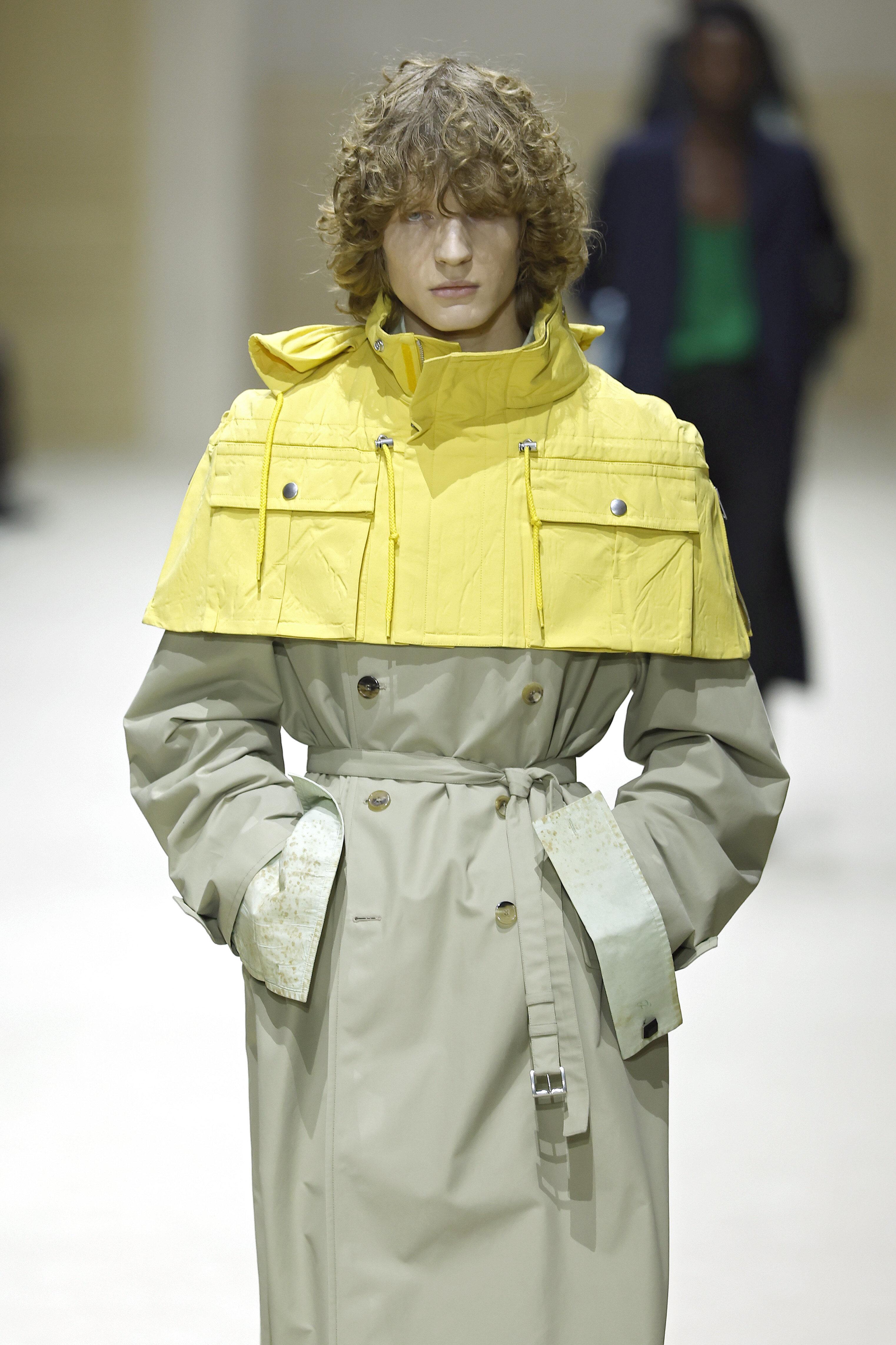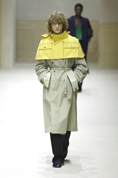 Причем, эта коллекция была не простой. В приглашении бренд не зря обозначил тему с манжетами — эти удлиненные элементы рукавов стали главным акцентом линейки, частью практически каждого образа, и, кажется, новым аксессуаром, вытеснившим часы. Хотя деталей в коллекции было много. Например, цветной трикотаж, который играл роль контрастного акцента и разбавлял довольно спокойную цветовую гамму, игривые панами, а также суперукороченные яркие кейпы-плащи. Их предлагали носить тоже как акцент вместе с классическими тренчами. На Никитине как раз был такой желтый кейп, надетый поверх бежевого плаща, «грязные» манжеты с фактурой, напоминающей заплесневелость, классические черные брюки со стрелками и кожаные кеды с акцентными синими шнурками. Образ получился смелым, но при этом сдержанным — по всем канонам Prada.