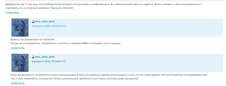 «Если же вы хотите психологическую консультацию Алисы по вопросу одаренности вашего сына, то это тоже дорого, 50 тысяч рублей за академический час, — сообщил Евгений. — Сами понимаете, специалист Алиса уникальный, времени у нее мало, поэтому цены кусаются».