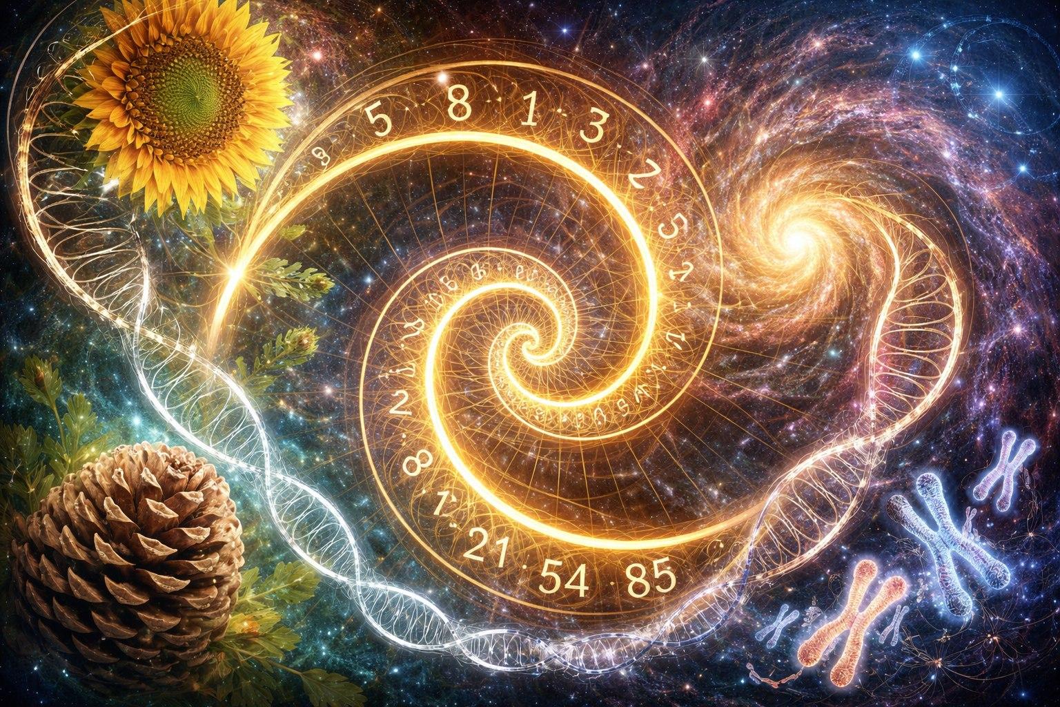 Следует сказать, что спираль Фибоначчи может быть двойной. Существуют многочисленные примеры этих двойных спиралей, встречающихся повсюду. Так спирали подсолнухов всегда соотносятся с рядом Фибоначчи. Даже в обычной сосновой шишке можно увидеть эту двойную спираль Фибоначчи. Первая спираль идет в одну сторону, вторая - в другую. Если посчитать число чешуек в спирали, вращающейся в одном направлении, и число чешуек в другой спирали, можно увидеть, что это всегда два последовательных числа ряда Фибоначчи. Число этих спиралей 8 и 13. В подсолнухах встречаются пары спиралей: 13 и 21, 21 и 34, 34 и 55, 55 и 89. И отклонений от этих пар не бывает!.. У Человека в наборе хромосом соматической клетки (их 23 пары), источником наследственных болезней являются 8, 13 и 21 пары хромосом...