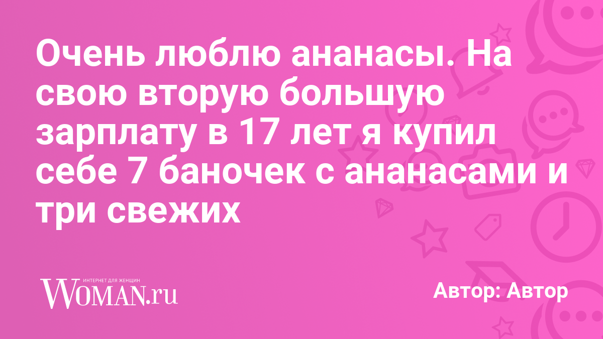 Очень люблю ананасы. На свою вторую большую зарплату в 17 лет я купил себе 7 баночек с ананасами и три в своём природном виде. Когда пришёл домой, первое, что я услышал, было от мамы: "Сынок, да ты ***" 😅