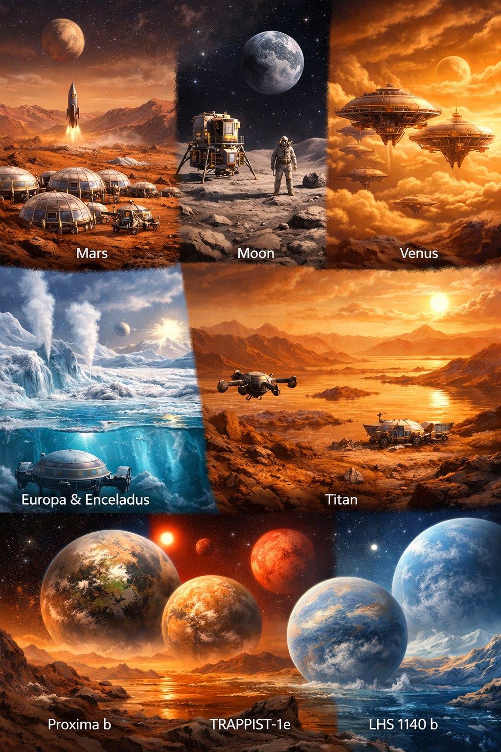 Марс - самый реалистичный кандидат. Плюсы: есть слабая атмосфера, вода в виде льда и смена времен года. Минусы: холод (до -120°C), радиация и лететь минимум 7 месяцев. Луна - наш ближайший сосед. Плюсы: лететь всего 3 дня. Можно быстро вернуться, если станет скучно. Минусы: нет атмосферы, резкие перепады температур, вездесущая липкая пыль. Венера. Облачные города на поверхности Венеры ад (температура +460°C и давление как на глубине 1 км в океане), но на высоте 50 км условия почти земные. Спутники-океаны: Европа и Энцелад. Это луны Юпитера и Сатурна, покрытые толстым слоем льда, под которым скрываются гигантские океаны жидкой воды. Титан. Мир метановых озер, самый странный спутник Сатурна. Это единственное место в Солнечной системе (кроме Земли), где есть реки, озера и идут дожди, но состоят они из жидкого метана. Экзопланеты. Proxima Centauri b. 4,2 св. года. Самая близкая к нам. Похожа на Землю по размеру. TRAPPIST-1e. 40 св. лет. Находится в центре обитаемой зоны, там может быть океан. LHS 1140 b. 48 св. лет. Недавние данные (2026г) подтверждают, что это может быть водный мир с азотной атмосферой.
