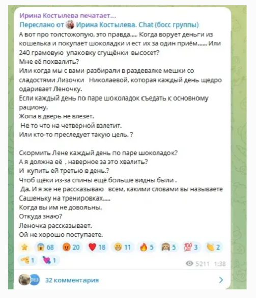 Она не только следила за питанием дочери, чтобы та не набирала даже лишние 500 граммов, но и присутствовала почти на всех тренировках. Ирина Костылева завела соцсети, в которых стала делиться успехами дочки и публиковать видео с тренировок и соревнований, а еще начала комментировать работу тренеров. Их она винила и в травмах дочери из-за чрезмерных нагрузок, и в том, что из-за малейшего отдыха Лене часто приходится с нуля восстанавливать ультра-си прыжки. Сначала со стороны это казалось лишь повышенным вниманием матери к достижениям талантливой дочери, однако недавно стало понятно, что ситуация перешла все мыслимые границы.
