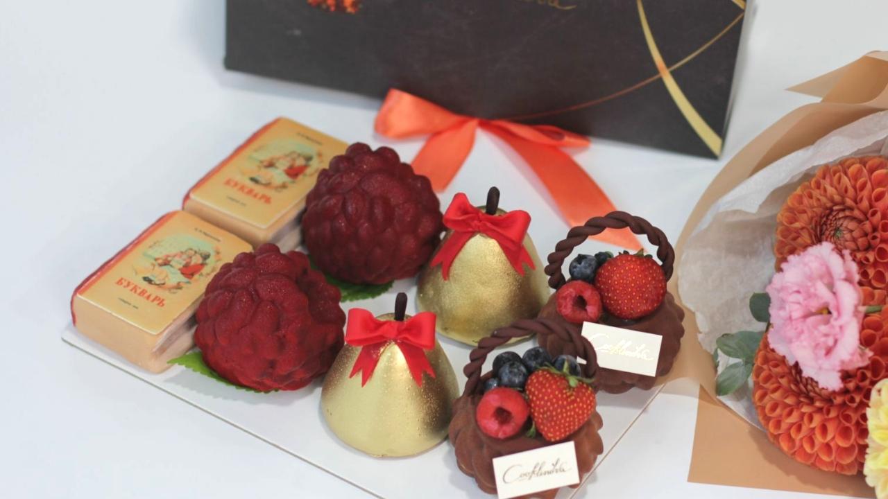 Десерты из коллекции к 1 сентября упакованы в праздничные коробочки. Сладкий подарок вы можете дополнить букетом, который со вкусом собран в Cooklinova Pastry.