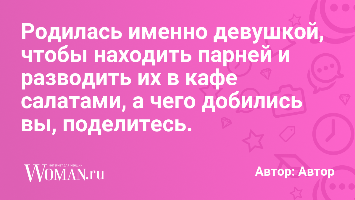 Родилась именно девушкой, чтобы находить парней и разводить их в кафе салатами, а чего добились вы, поделитесь