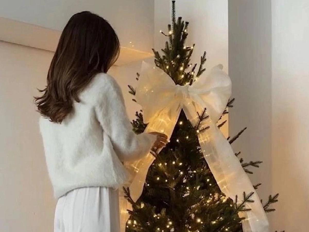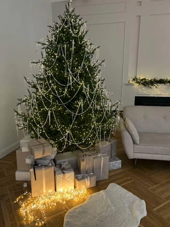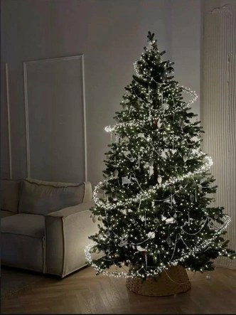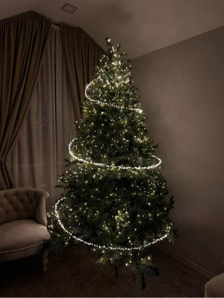 Для любителей современного дизайна и чистых линий соцсети предлагают смелый и эффектный тренд — украшение елки жесткой спиральной гирляндой. Это кардинально новый взгляд на то, как украсить елку на Новый год. Отказавшись от хаотичного обматывания веток, вы создаете вокруг дерева четкий, динамичный силуэт. Гирлянда-пружина огибает елку от самого низа до макушки, почти не касаясь ветвей.