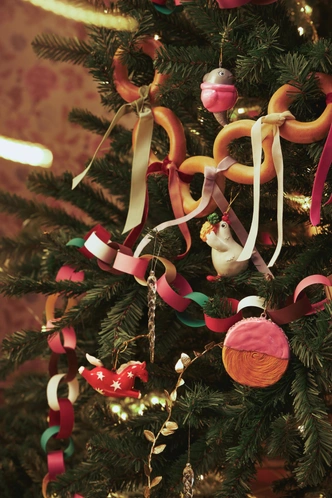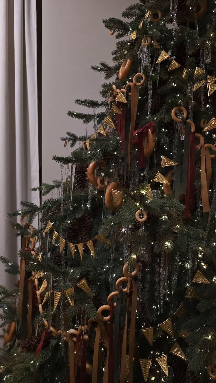 Как украсить елку на Новый год в этой стилистике? Позвольте себе немного поностальгировать и окунуться в детство. На ветках будут прекрасно смотреться засушенные дольки апельсина, палочки корицы, декоративный хлопок, позолоченные грецкие орехи, фигурки из соломы и вязаные миниатюры. А кто-то даже вешает на ель маленькие имбирные пряники, пирожки (надеемся, лишь для фото) или гирлянды из сушек и баранок. Такие украшения создают невероятно душевную и практически «рукотворную» атмосферу.
