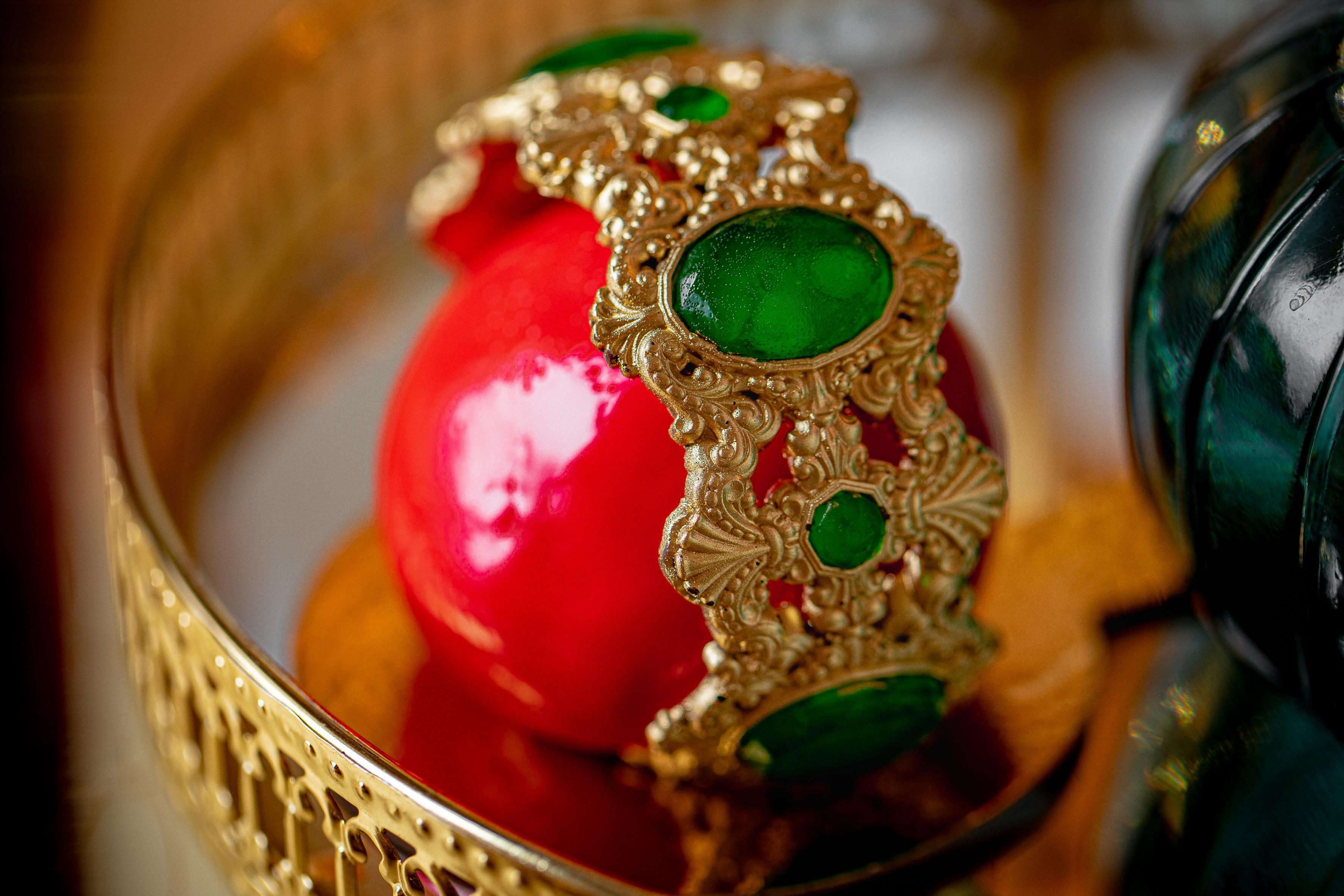 «Эмеральд» — пирожное-браслет: миндально-кокосовый бисквит, яркий малиновый мусс, карамелизированные фисташки и нежный мусс пломбир. Сам браслет выполнен из темного шоколада.