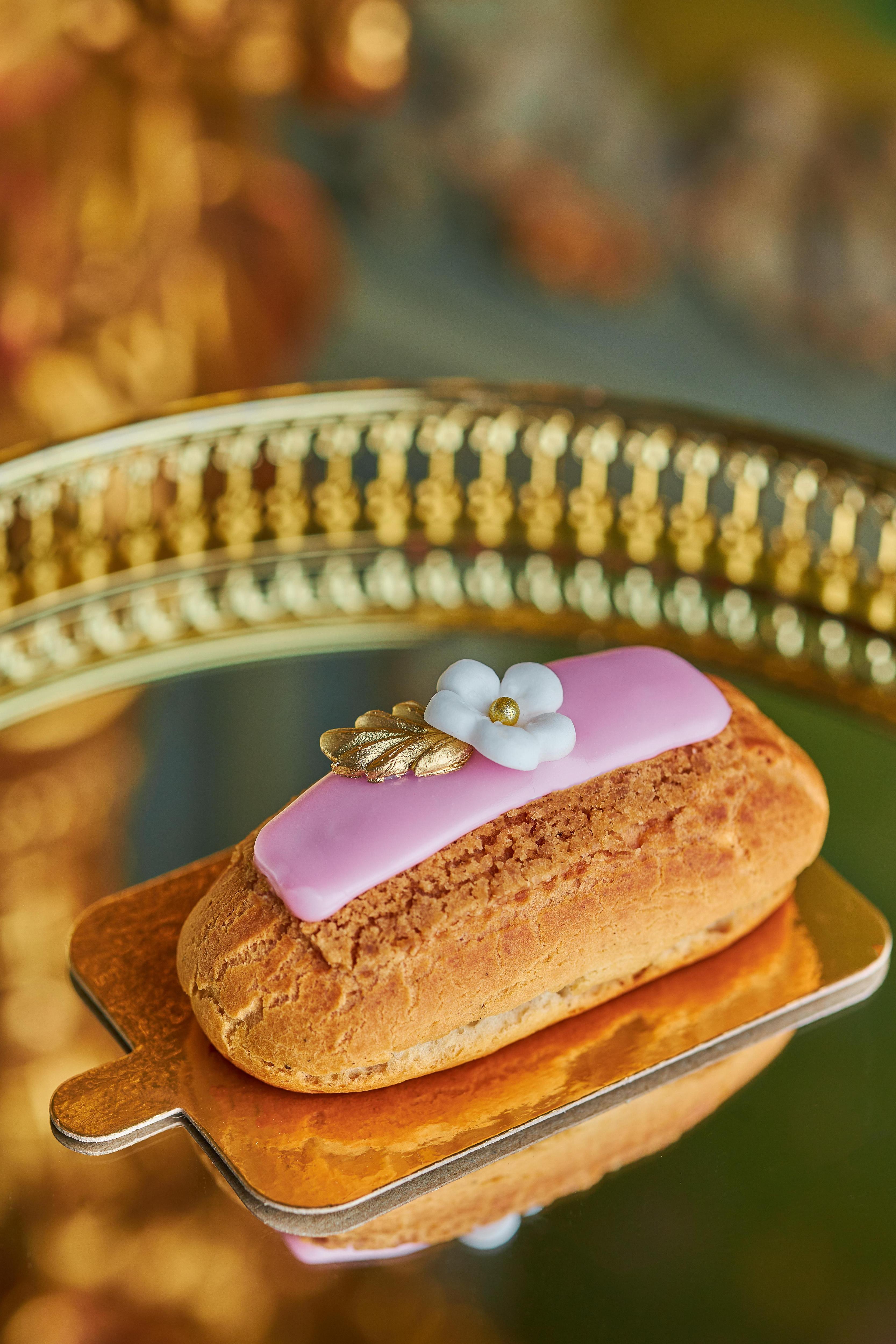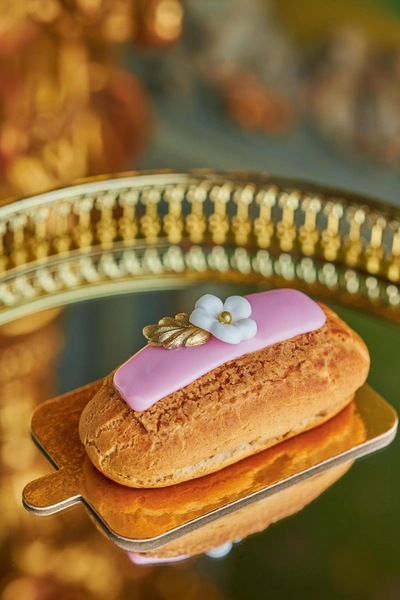Эклер с кремом-пломбиром и малиновым конфи украшен помадкой и бутоном из мастики. Пирожное «Кувшинка» сделано из розового велюра, под которым скрыты лимонный и кокосово-миндальный бисквиты, заполненные малиновым кремом и муссом из белого шоколада и мака.