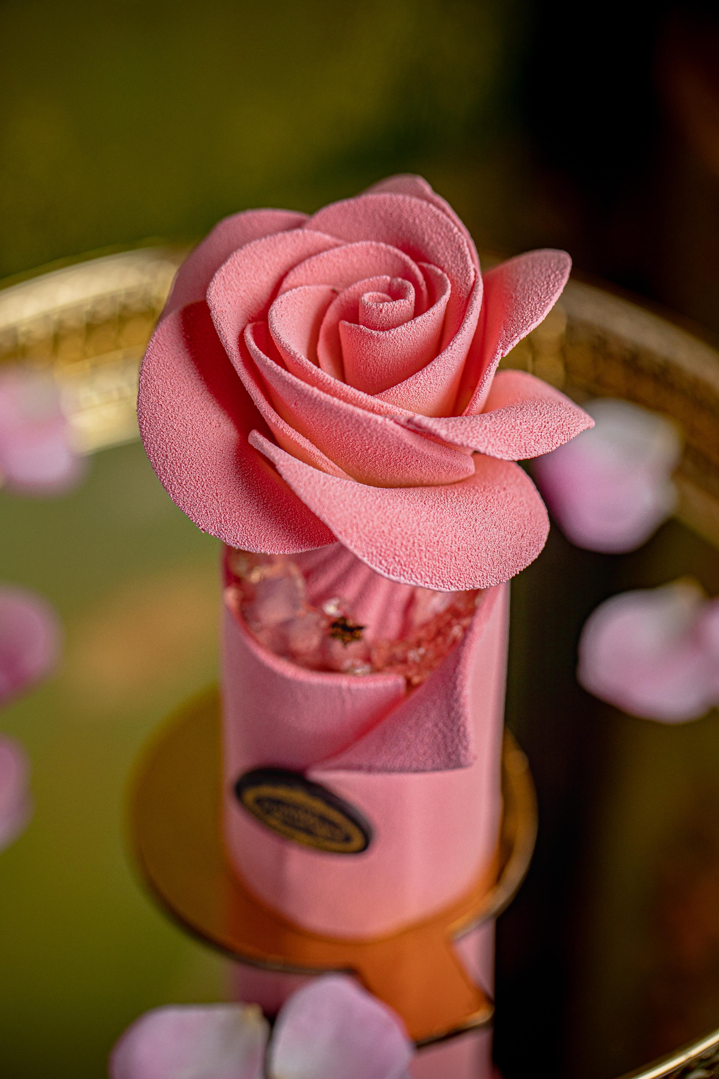 Макарон «Фиалка», выпеченный с двойным кремом, украшен миниатюрными цветками. «Королевская роза» — это миндальный бисквит, малина и конфи каркаде под куполом белого шоколада; в центре — ванильный ганаш с темным шоколадом.