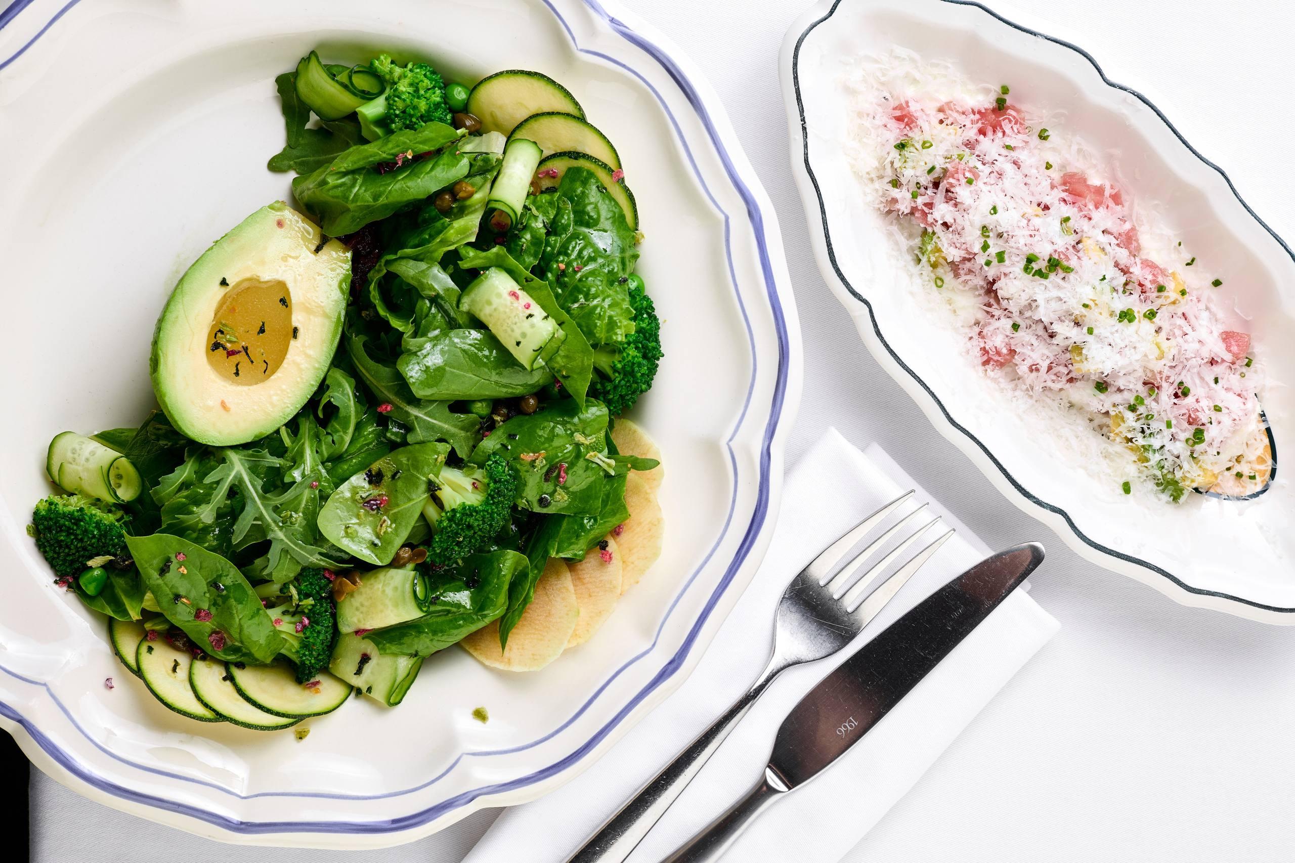 Начать советует с RAW-бара. Первая подача — карпаччо из говядины в виде тонких слайсов мяса с пармезаном и руколой, а к тартару из говядины — хрустящие корнишоны, каперсы, ароматную трюфельную пасту и картофельный гратен. И какой же полноценный обед без салатов? Здесь рекомендуем обратить внимание на вариант с морепродуктами (осьминог, кальмар, креветки и мидии), печеным картофелем и томатами или с артишоком, листьями мини-шпината, авокадо и яблочной мастардой. Без яблока, как мы помним, в Mela никуда.