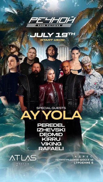 Только представьте группа AY YOLA в роли хедлайнера, dj-сеты от Peredel, Izhevski, Deomid и резидентов клуба Atlas раздадут лету жары. Организаторы советуют не опаздывать, ведь открывать party будет резидент Atlas Moscow — RAFAELI. Дальше за пульт встанут VIKING и KÍRRU, а у них вайб летнего знойного вечера подхватят B2B — Back to Back.