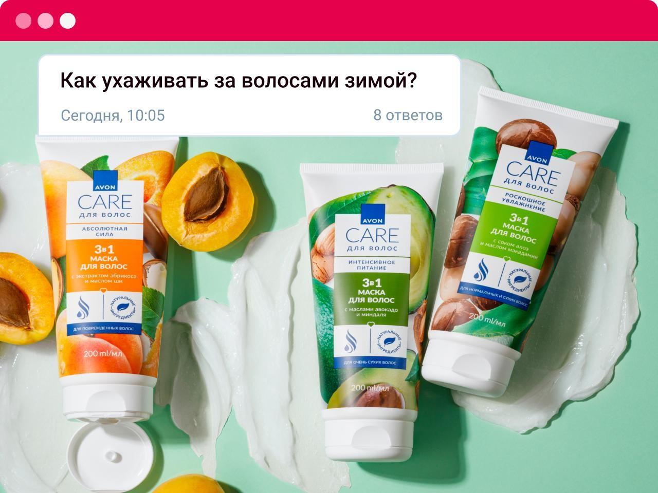 Маски 3 в 1 от Avon Care: «Интенсивное питание» с маслами авокадо и миндаля, «Абсолютная сила» с абрикосом и маслом ши, «Роскошное увлажнение» с алоэ и макадамией — подходят для любых типов волос и обеспечивают в 3 раза меньше ломкости.