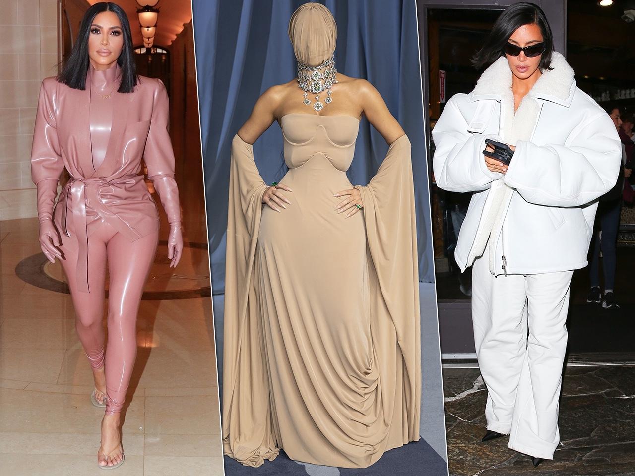 В 2019 году на Met Gala Ким доказала, что «голый» наряд может быть не просто эпатажем, но и высоким искусством. На ней было платье от Mugler телесного цвета, с ювелирной точностью имитировавшее обнаженное тело, с которого стекают капли воды. Это была первая работа самого Тьерри Мюглера за два десятилетия, вдохновленная культовым образом Софи Лорен из фильма «Мальчик на дельфине». Наряд из бежевого латекса, украшенный сложнейшей вышивкой из бисера и полупрозрачных кристаллов Swarovski, сидел настолько туго, что Ким едва могла дышать и двигаться. Сидеть в нем было физически невозможно.