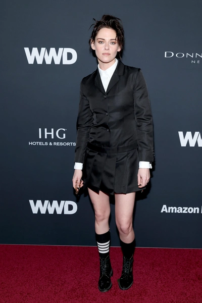 Кристен Стюарт этим вечером пришла поддержать своего стилиста по волосам Адира Абергела, который тоже удостоился награды. Именно он помог Стюарт найти ее нынешний, такой узнаваемый образ. Если раньше ее прическа ассоциировалась с шоколадными каскадными волнами, то с приходом Абергела она стала более дерзкой и готичной. Он создал для актрисы те самые панковские хвостики, короткие рваные челки и боб-каре, которые стали ее визитной карточкой. На церемонию Кристен надела строгий черно-белый ансамбль Thom Browne с плиссированной юбкой и разными носками.