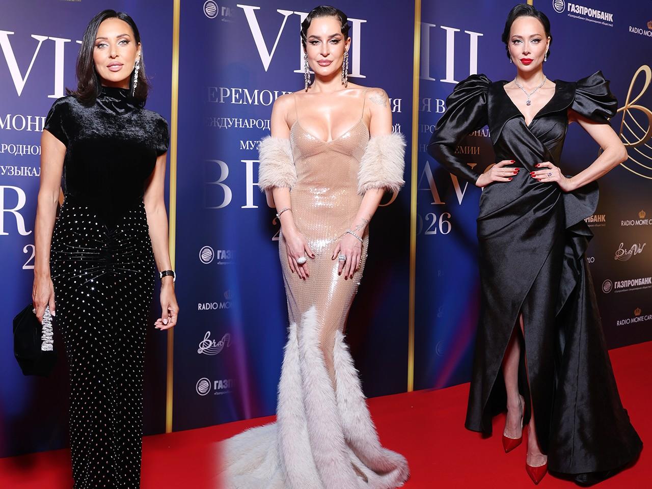 Однако не все звезды отдали предпочтение темным и закрытым нарядам. Пока одни обсуждали лауреатов, другие — платье Севиль. Солистка группы Artik & Asti появилась на мероприятии в бежевом расшитом пайетками платье в пол. Если бы не меховые вставки, платье было бы почти невидимым.